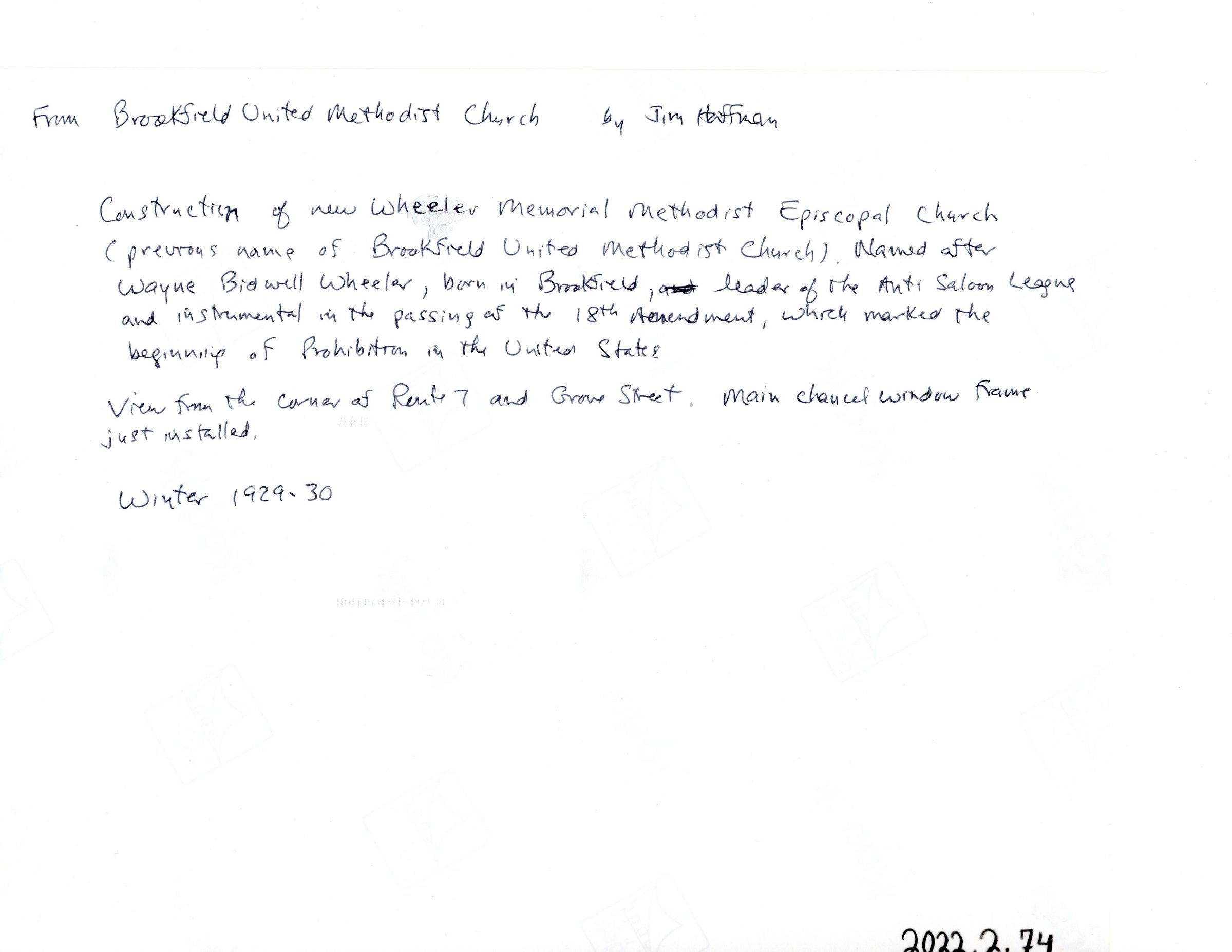 Construction of new Wheeler Memorial Methodist Episcopal Church 1929-1930, named after Wayne Bidwell Wheeler, born in Brookfield, leader of the Anti-saloon League and instrumental in the passing of the 18th Amendment.