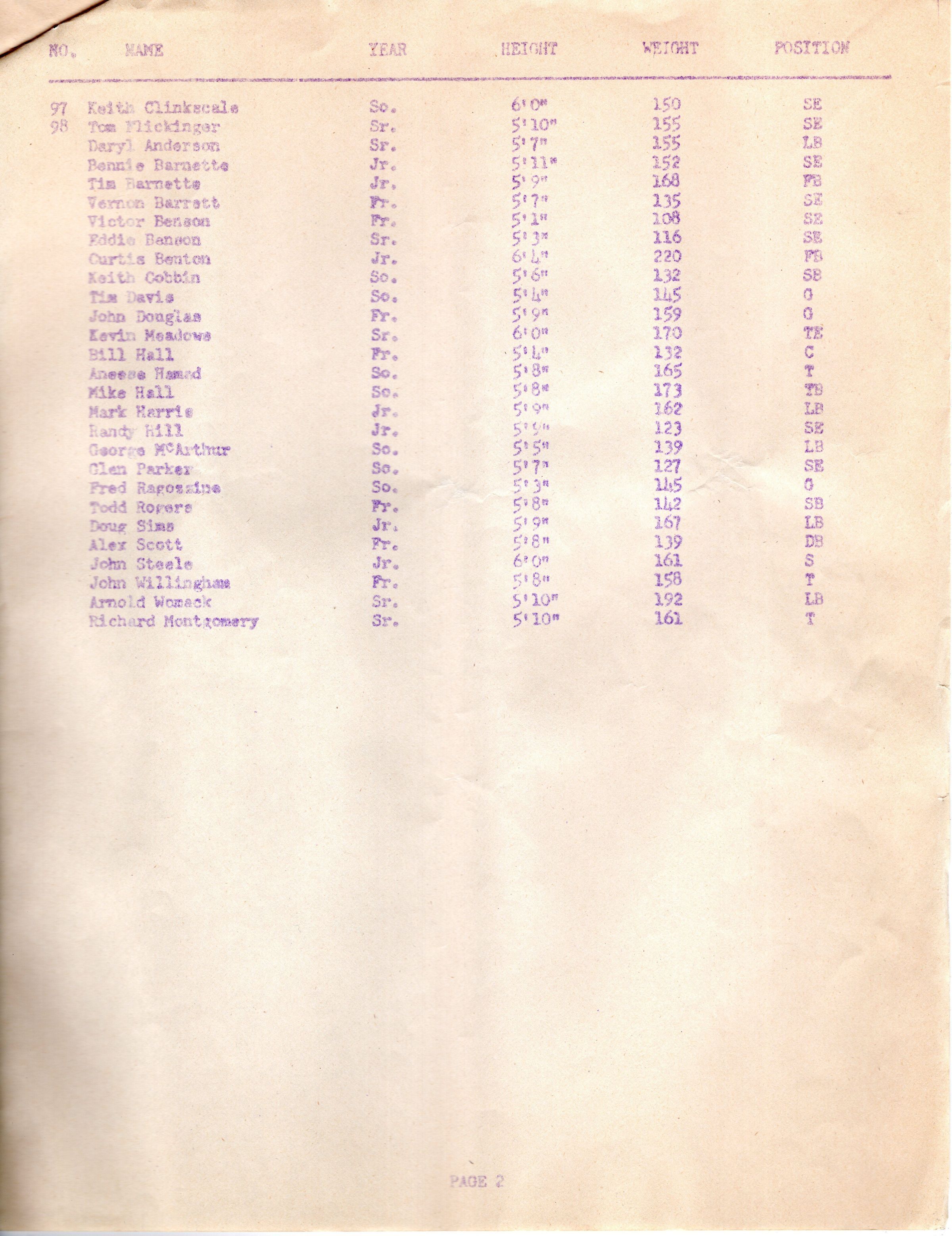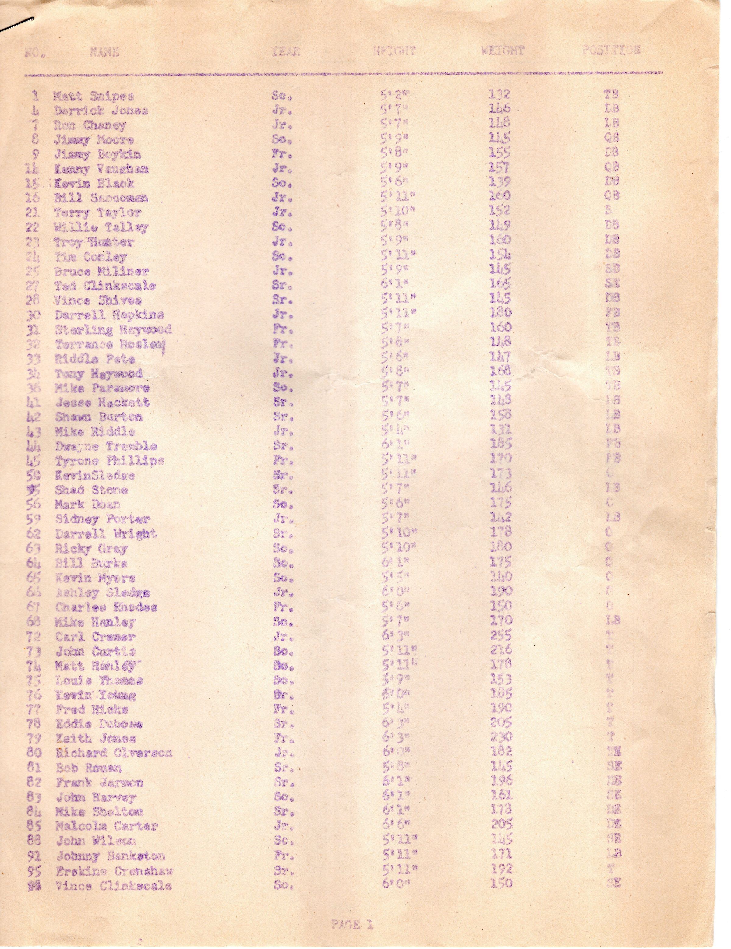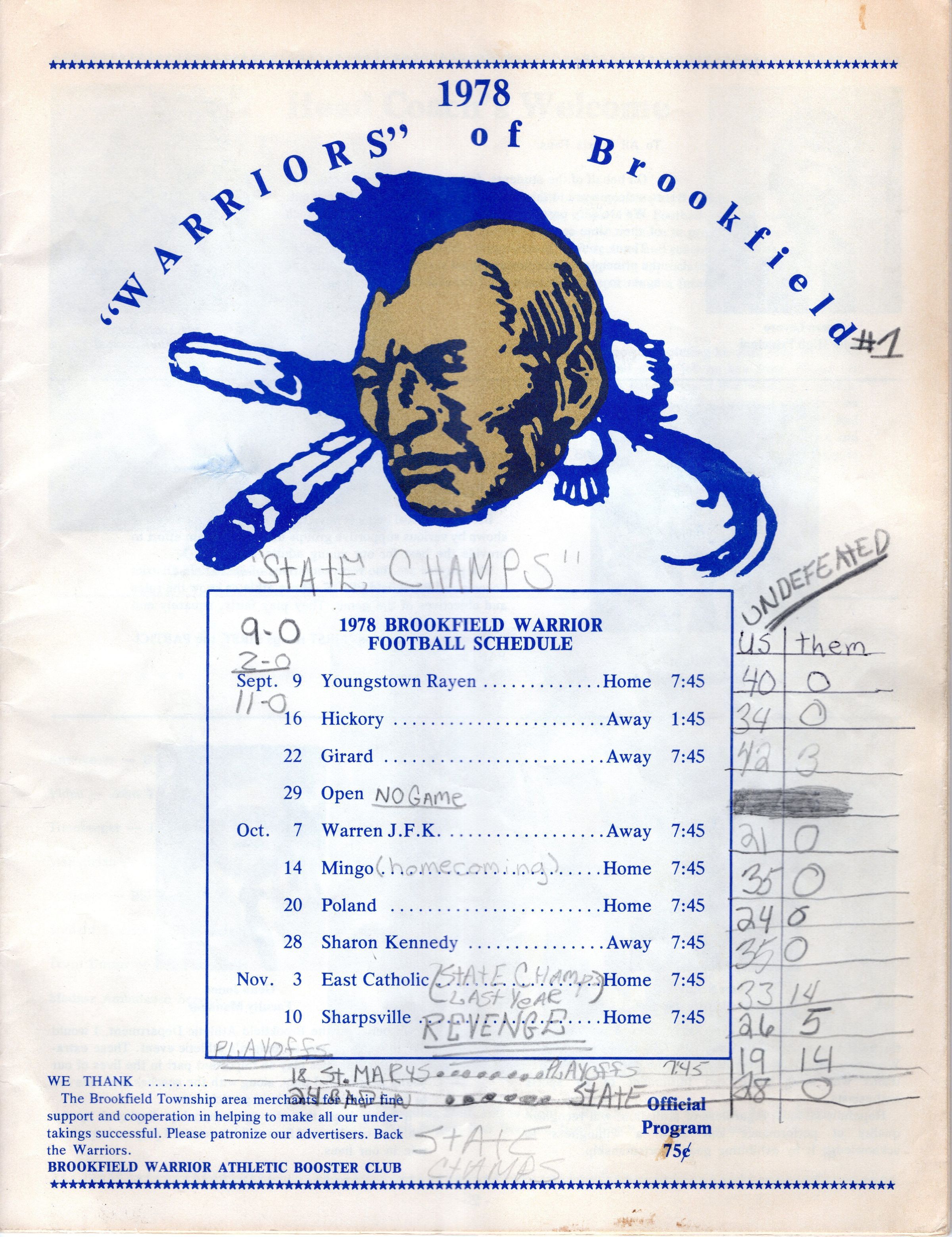 Brookfield Warrior 1978 Football Schedule with Player Roster