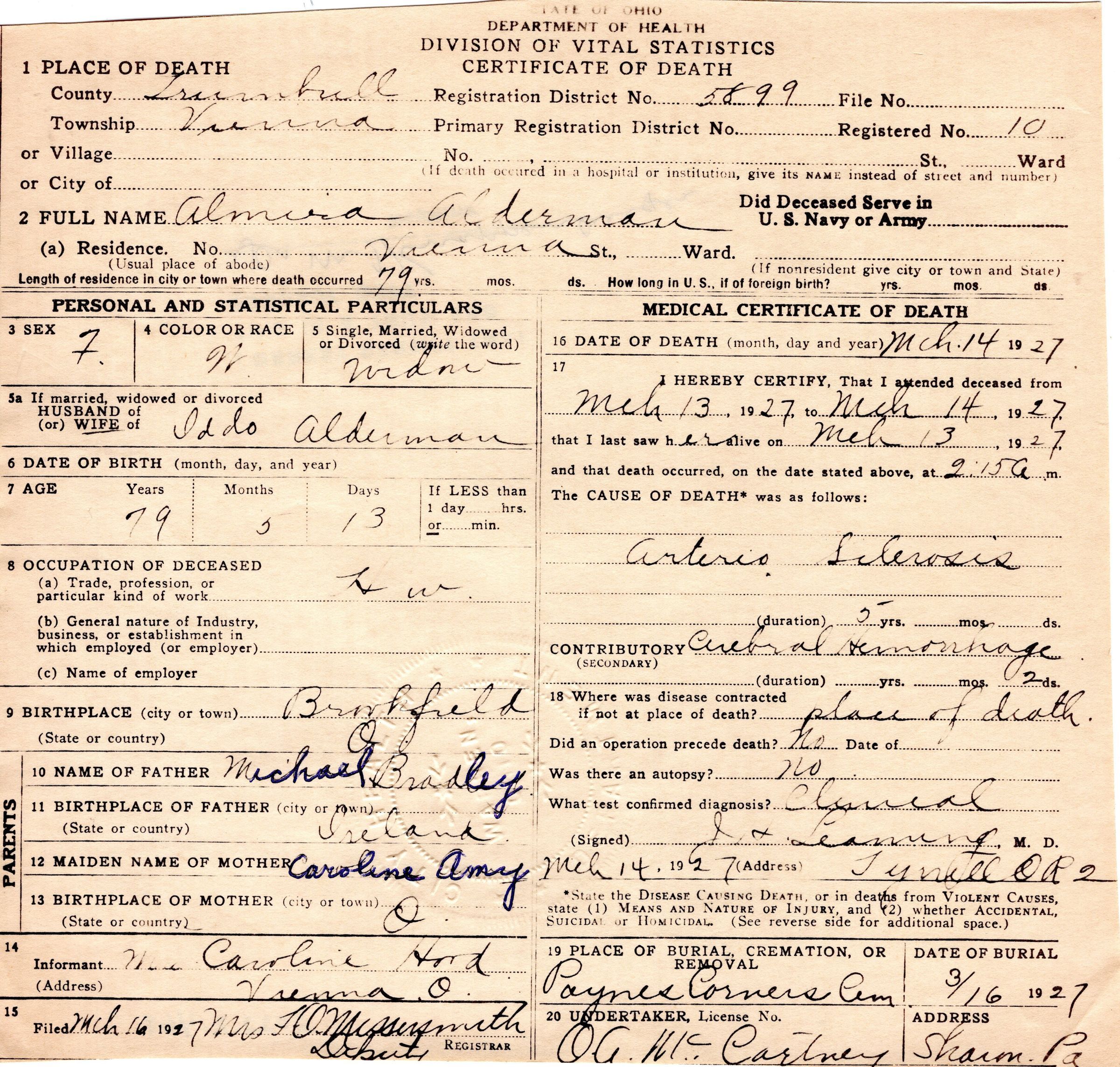 Death certificate for Almira Alderman, March 1927