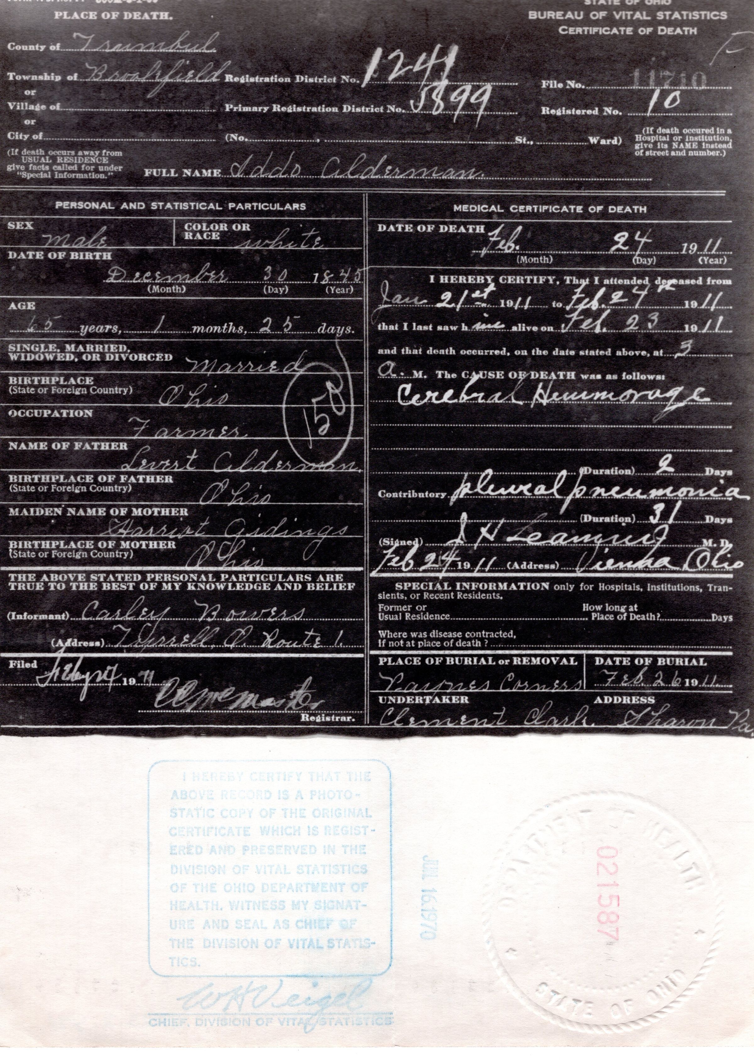 Death Certificate, Alderman, Iddo, 1911