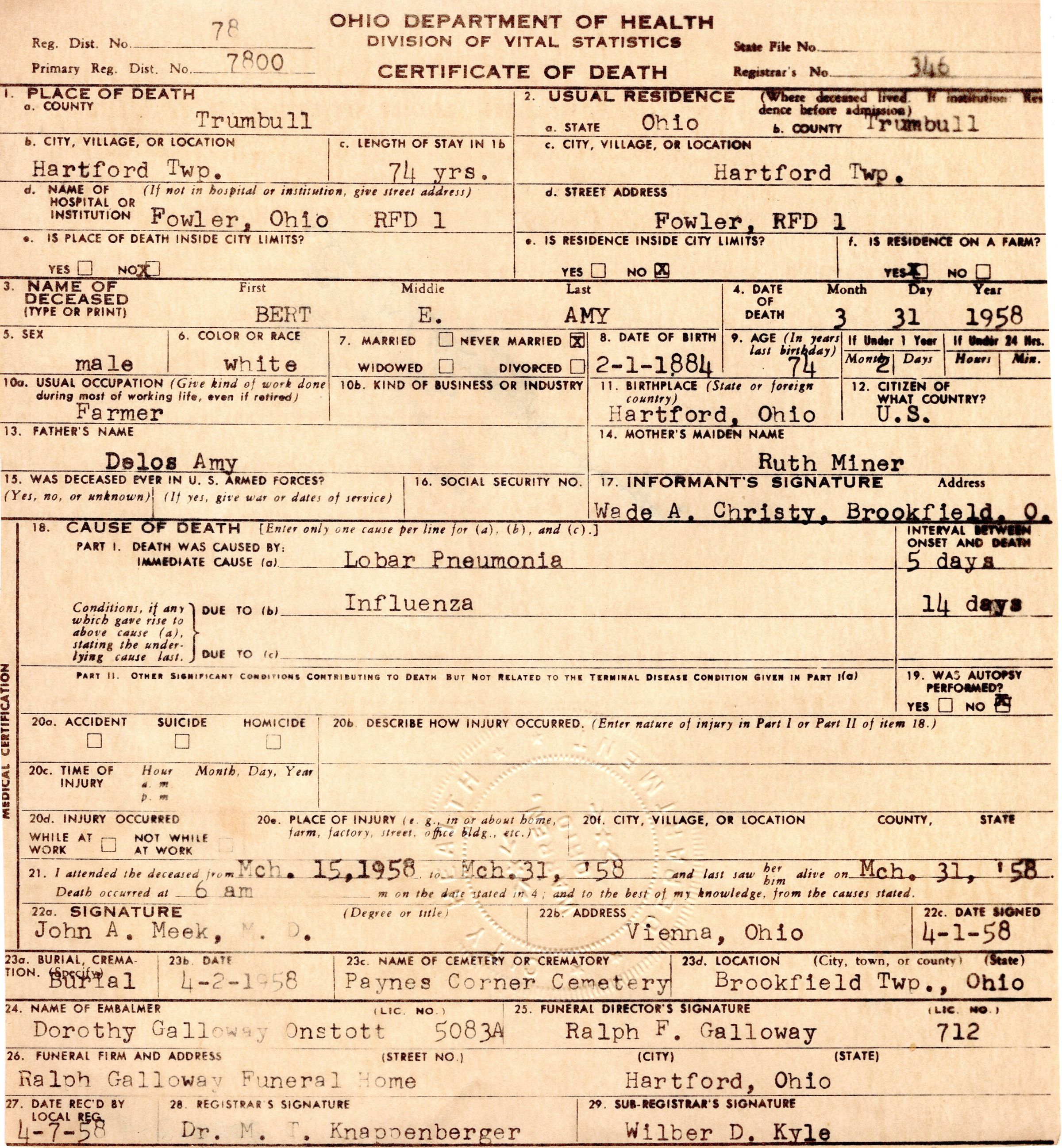 Death Certificate, Amy, Bert, 1958