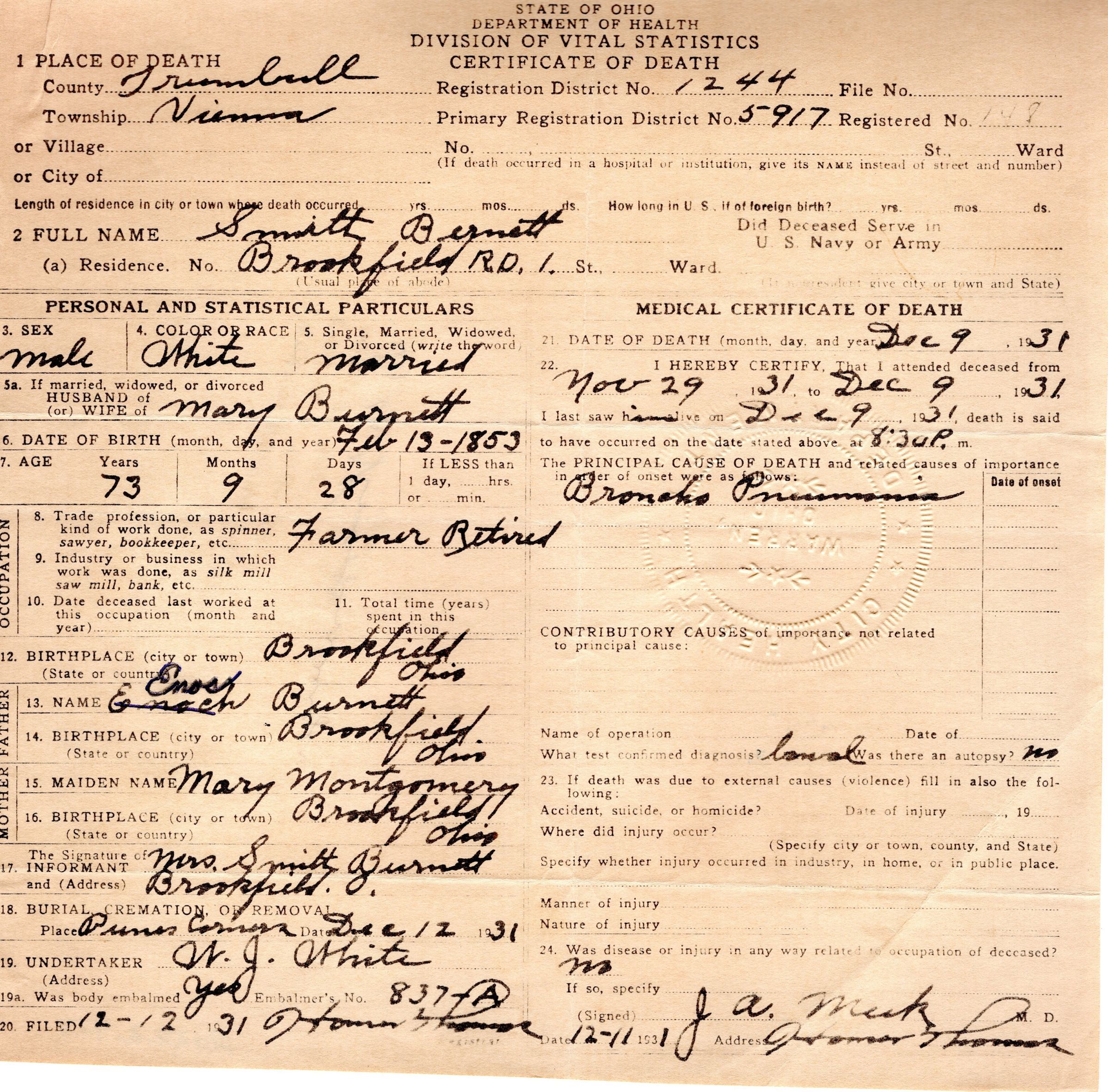 Death certificate for Smith Burnett, December, 1931