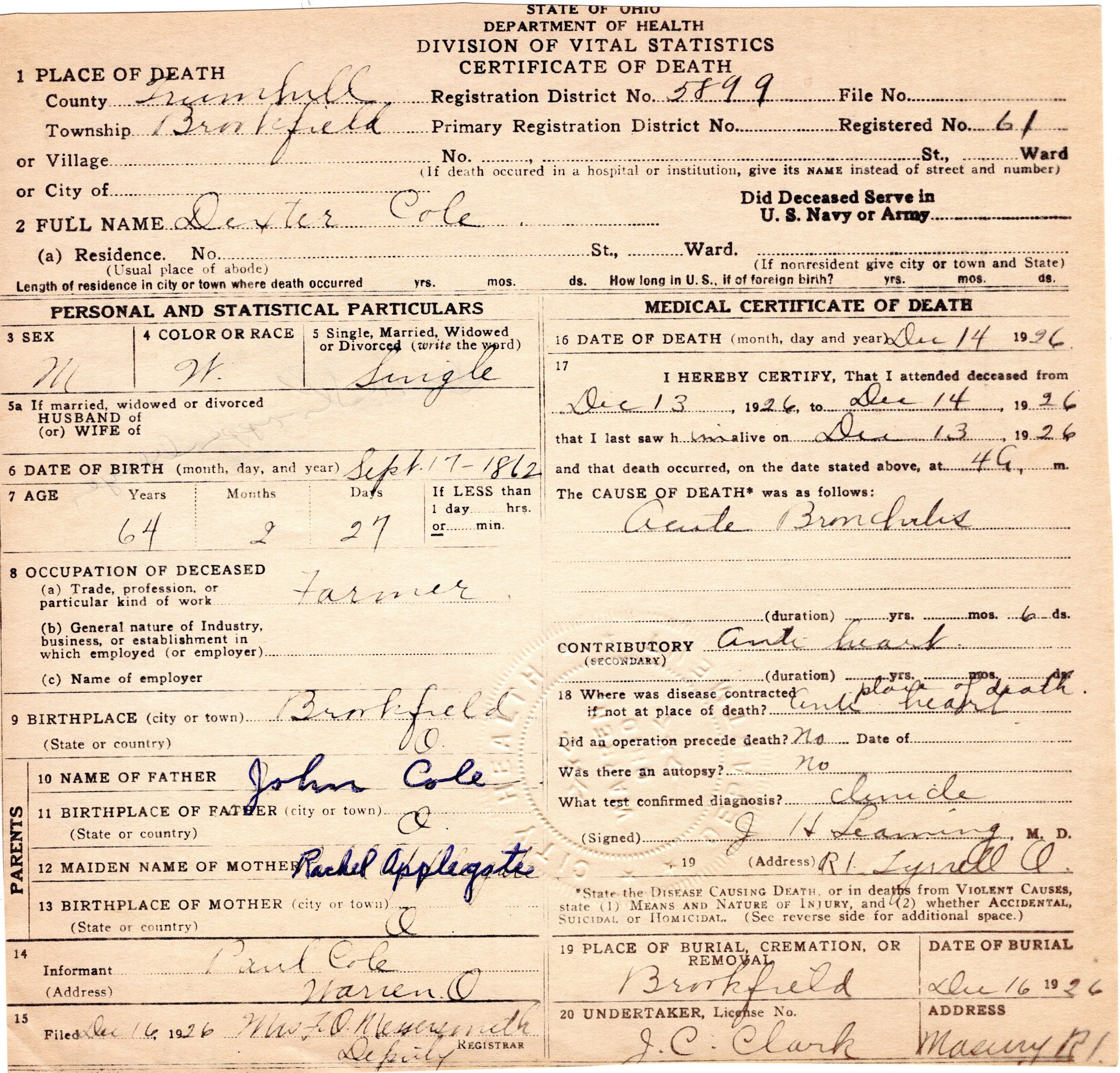 Death Certificate, Cole, Dexter, 1926