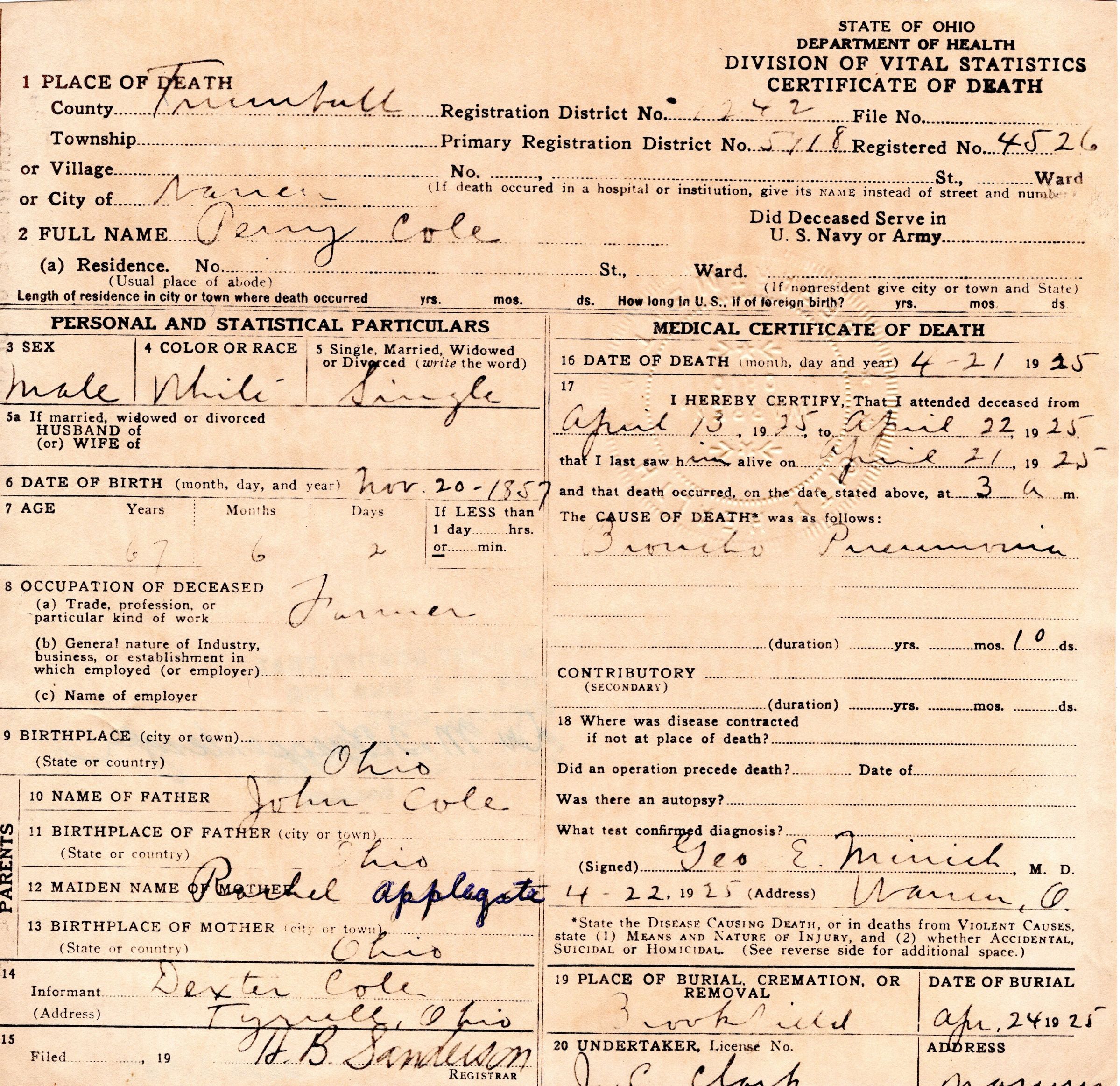 Death certificate for Perry Cole, April 1925