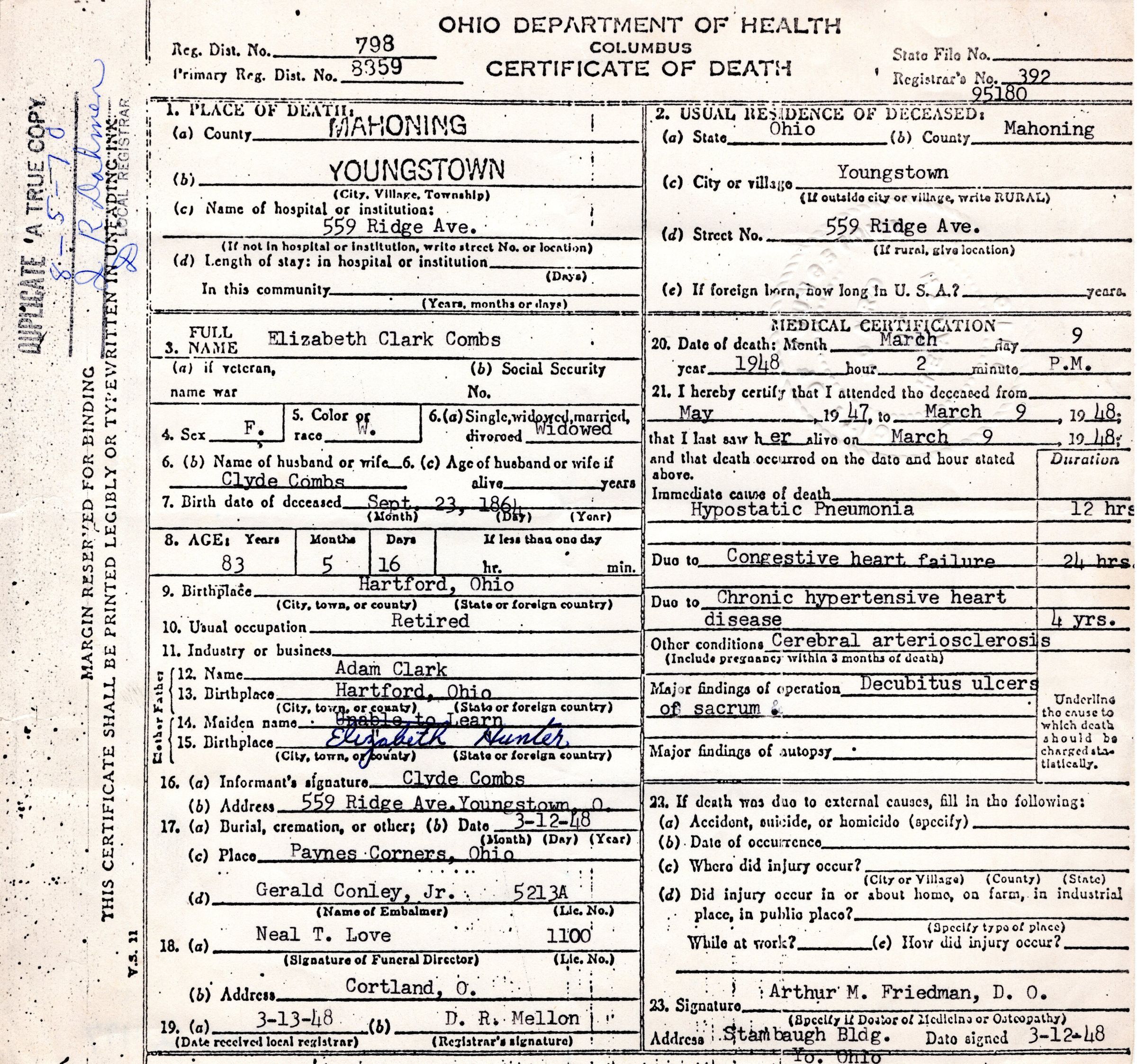 Death certificate for Elizabeth Clark Combs, March 1948