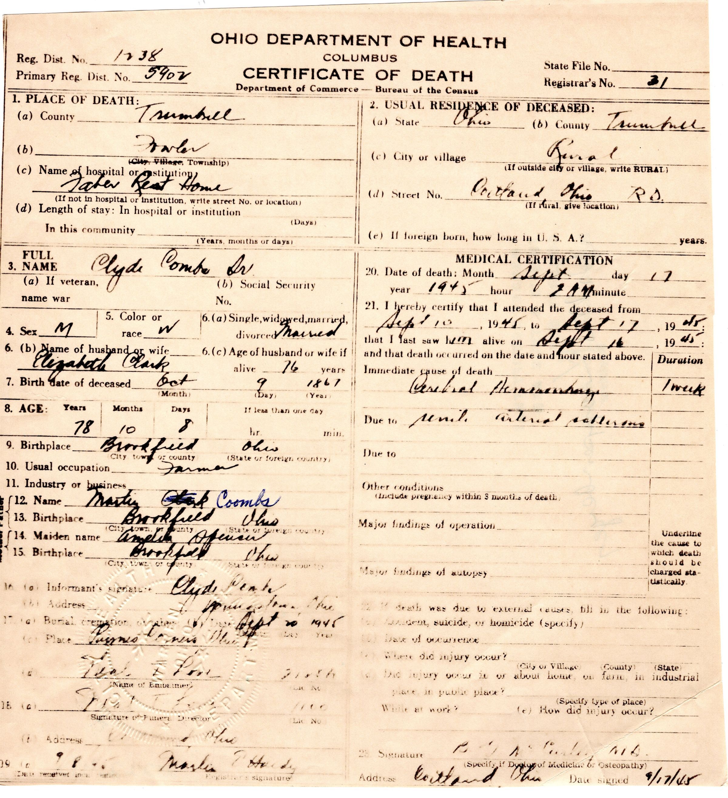 Death Certificate, Combs Sr, Clyde, 1945