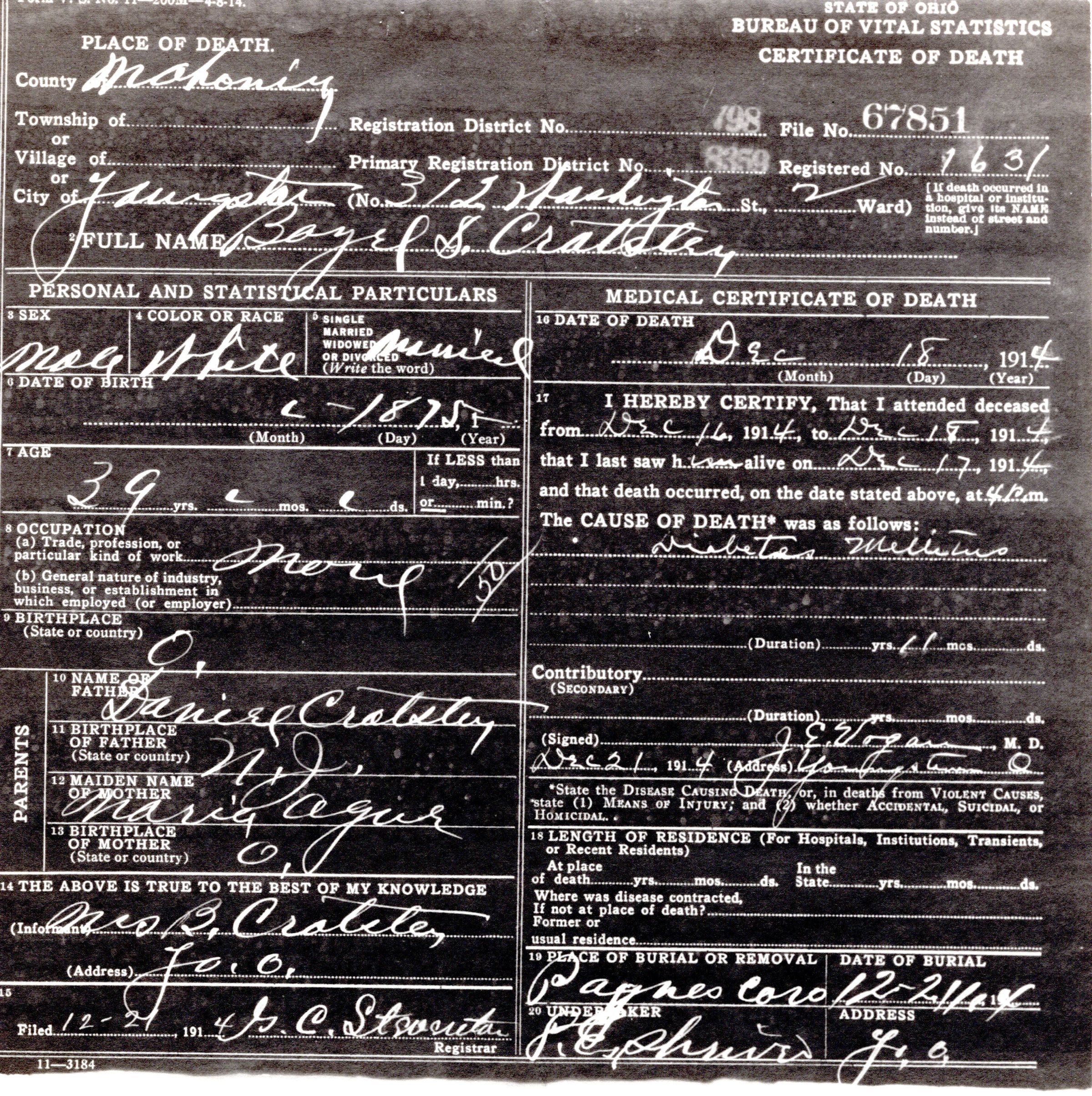 Death certificate for Bazel S. Cratsley, December 1914