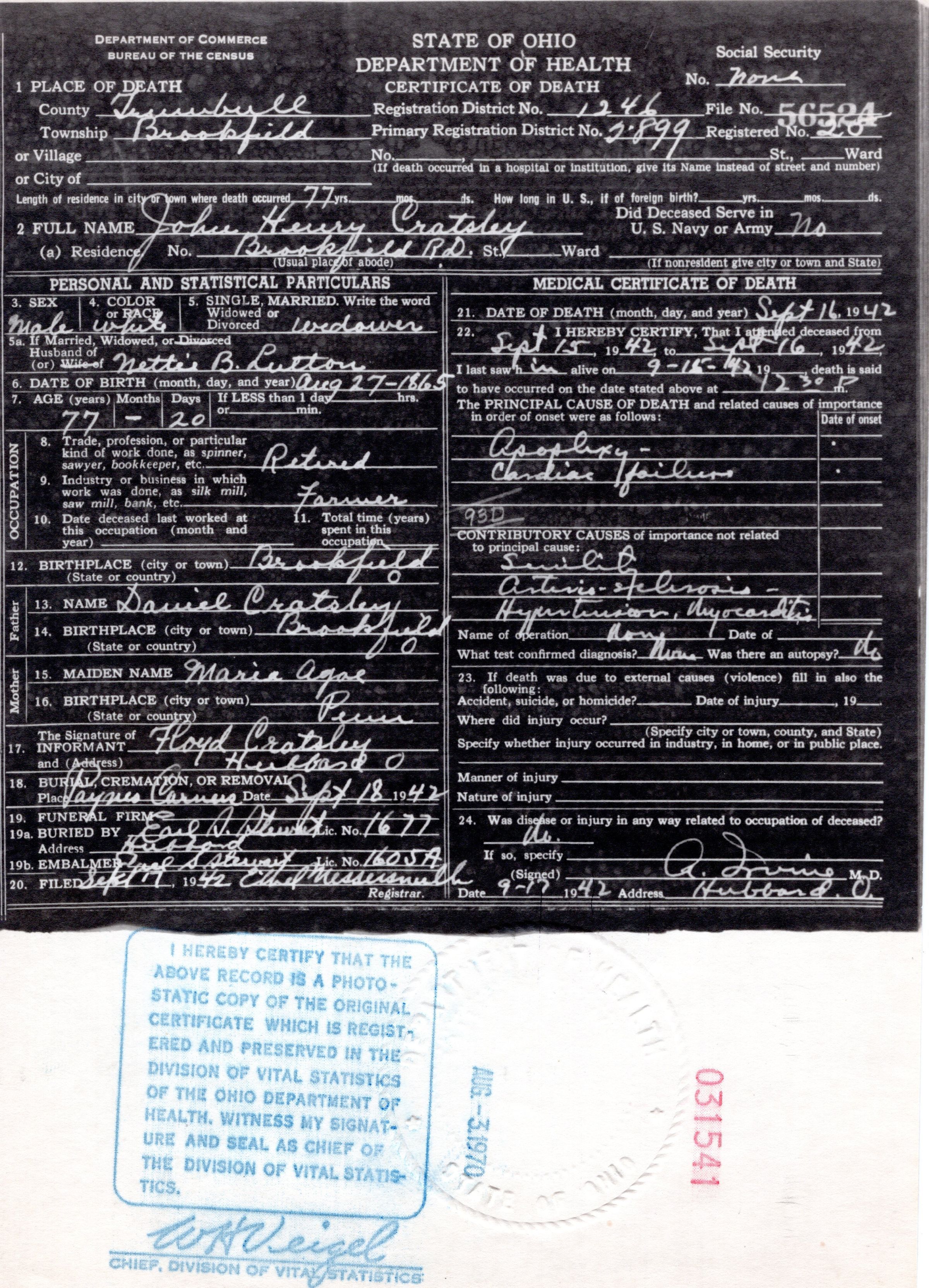 Death certificate for John Henry Cratsley, September 1942