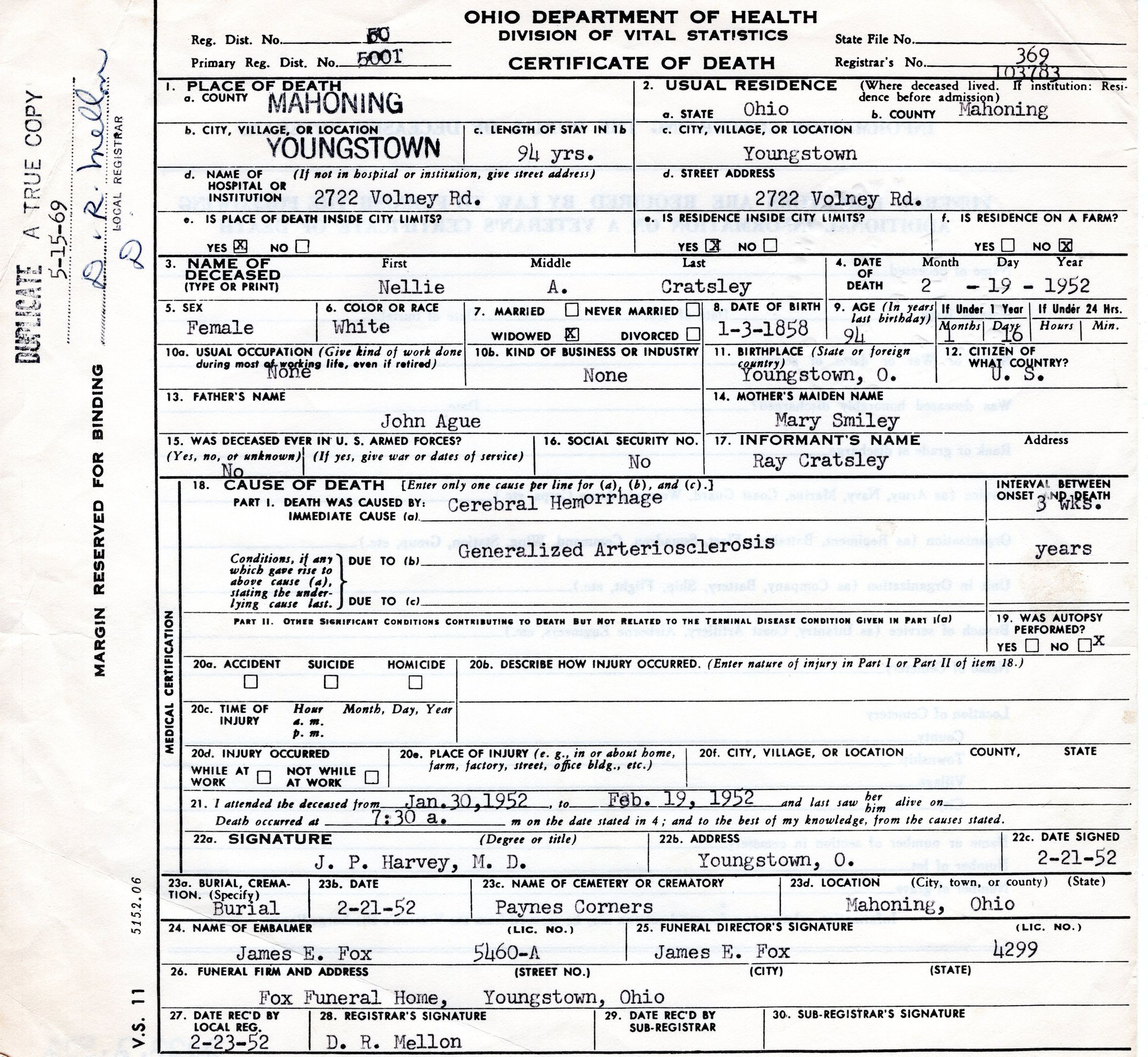 Death certificate for Nellie A. Cratsley, February 1952