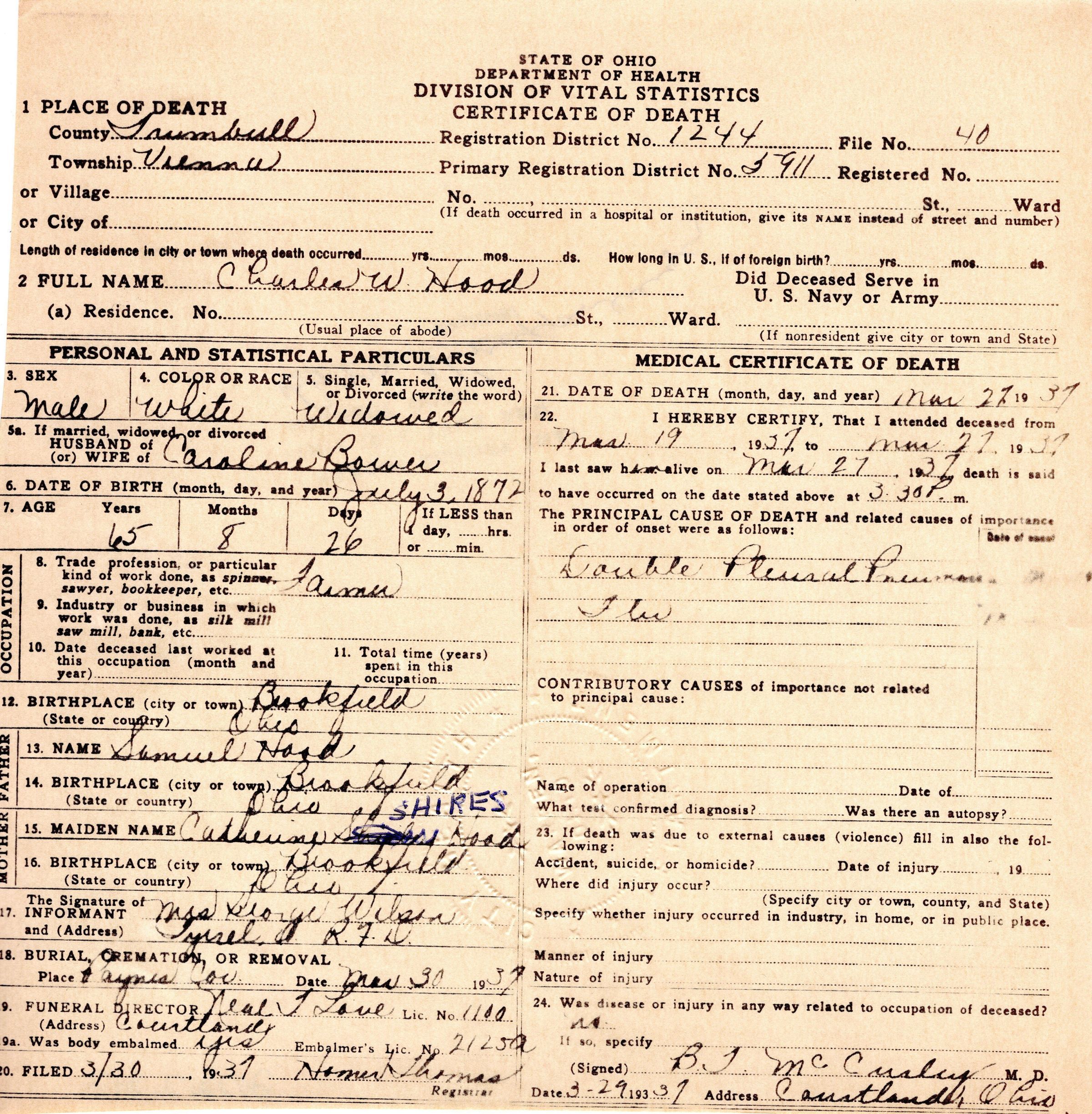 Death Certificate for Charles W. Hood, March 27, 1937..