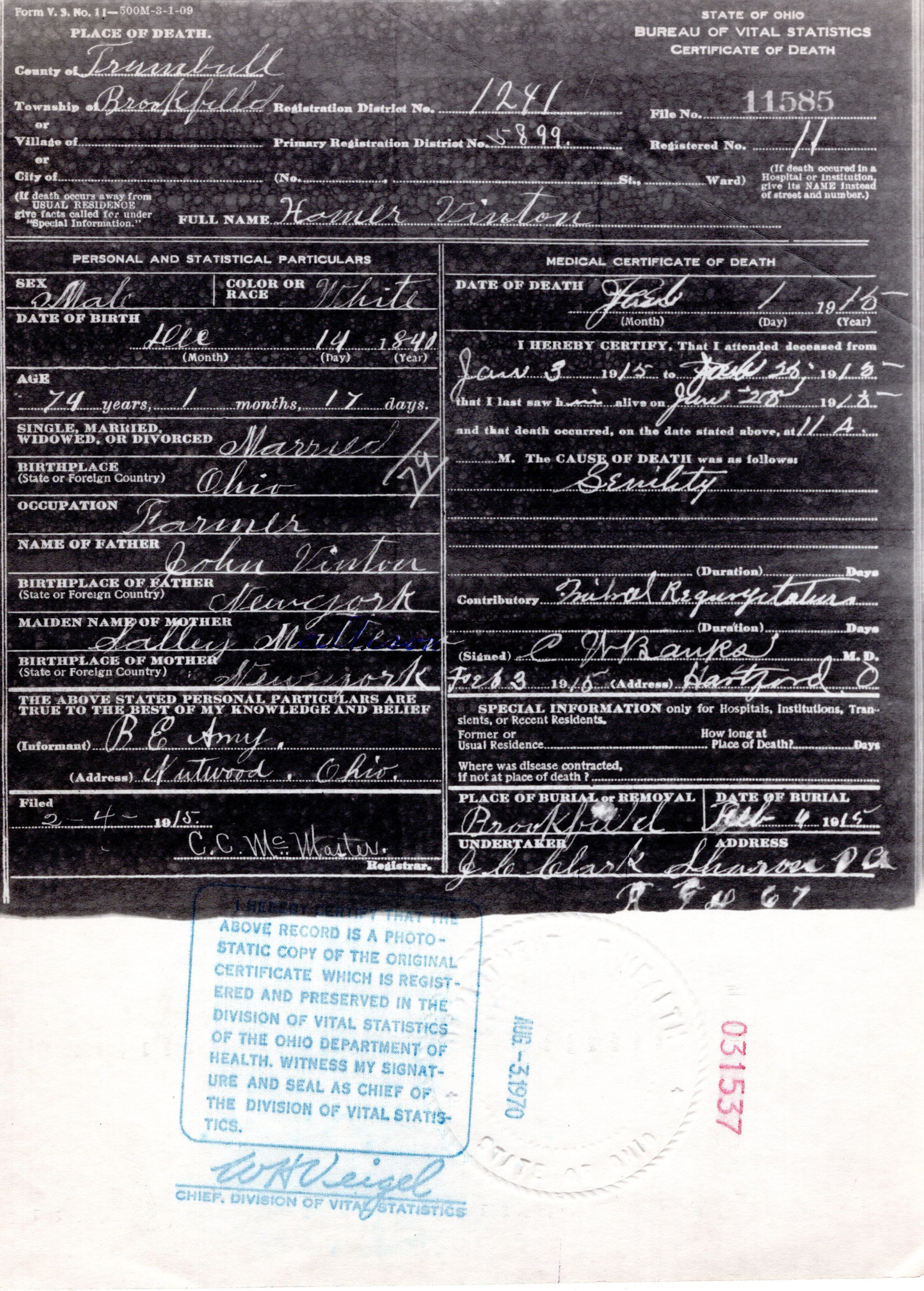 Death Certificate for Homer Vinton, 1915