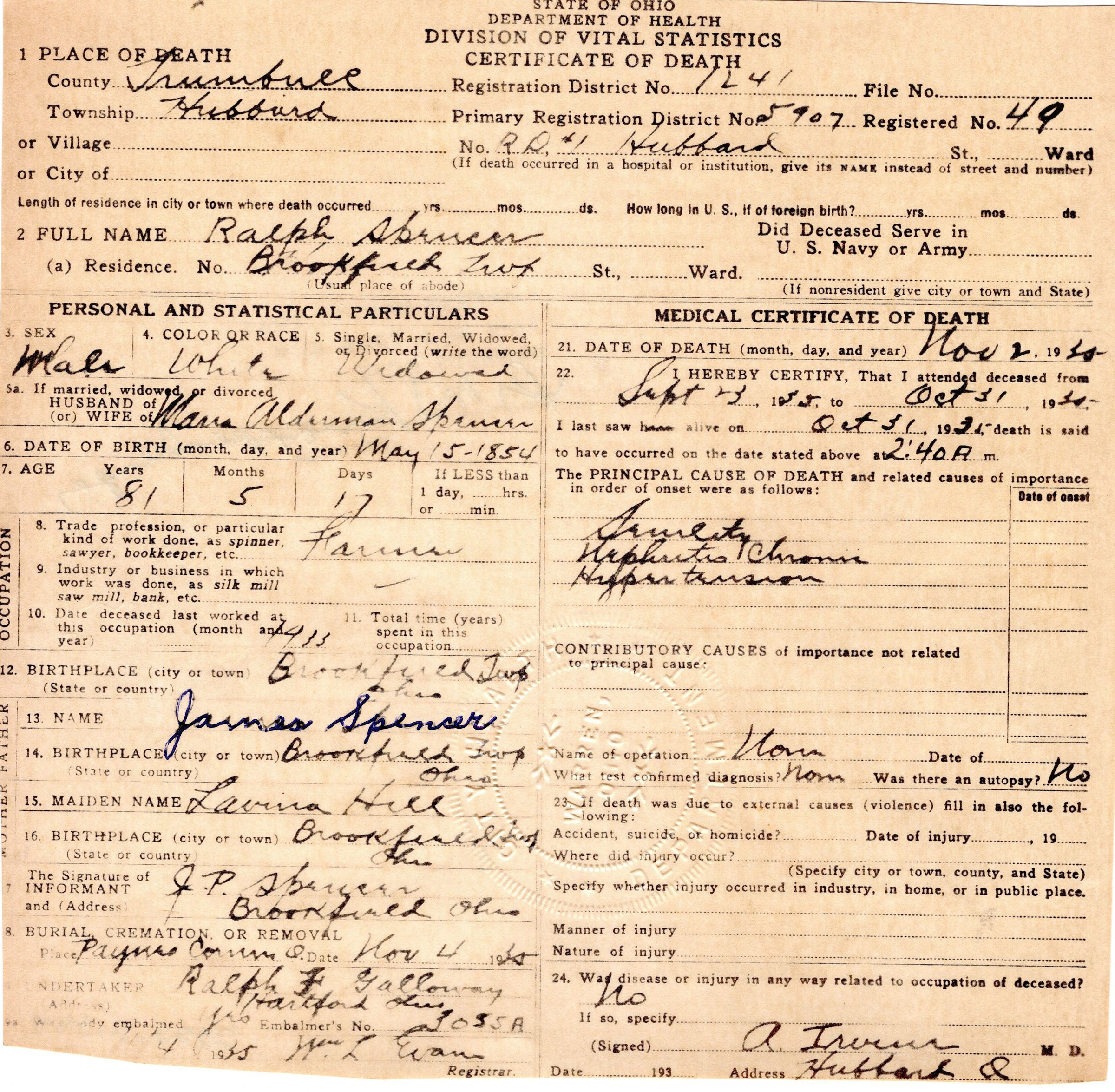 Death certificate for Ralph Spencer, November 2, 1935