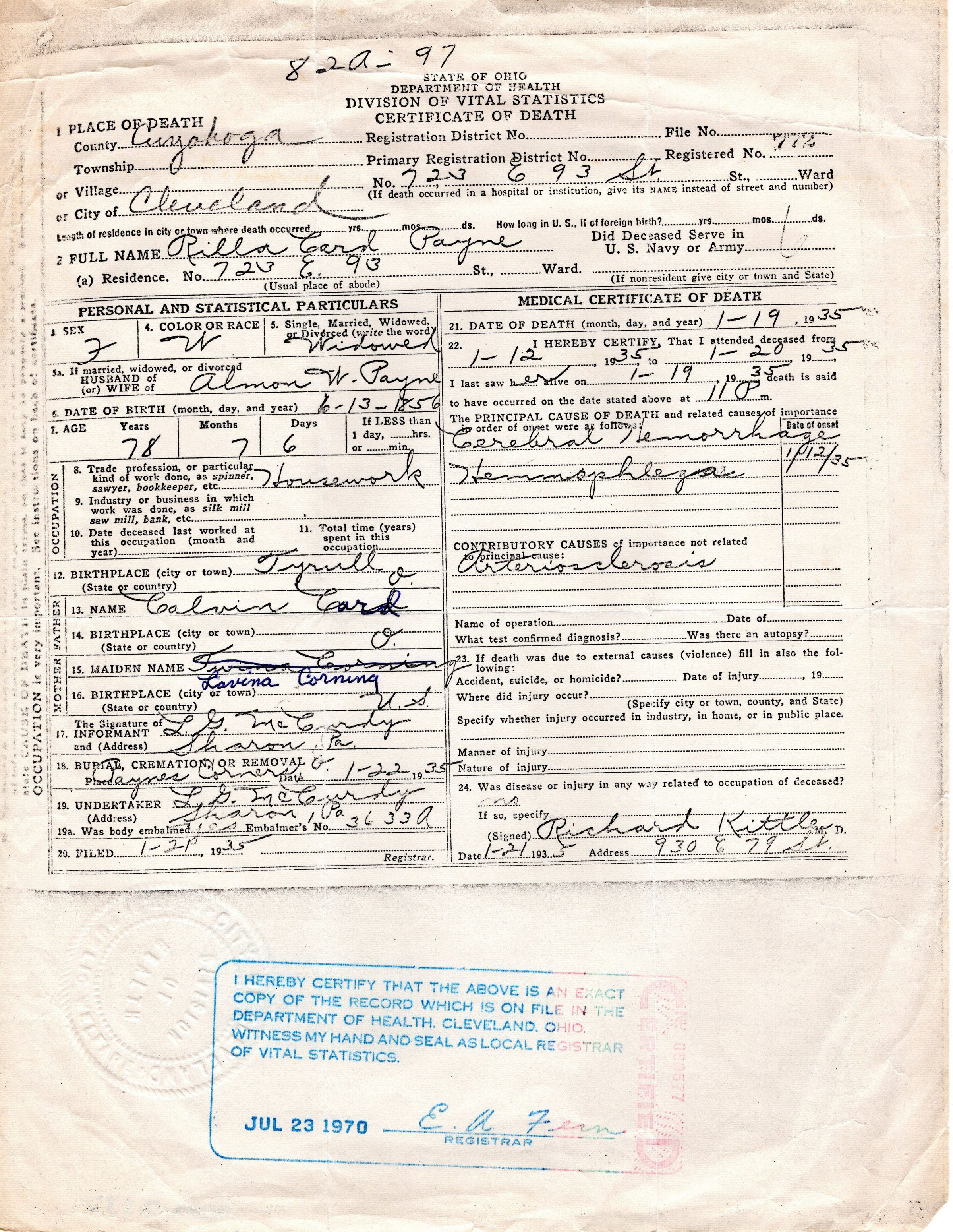 Death Certificate for Rilla Card Payne, 1935