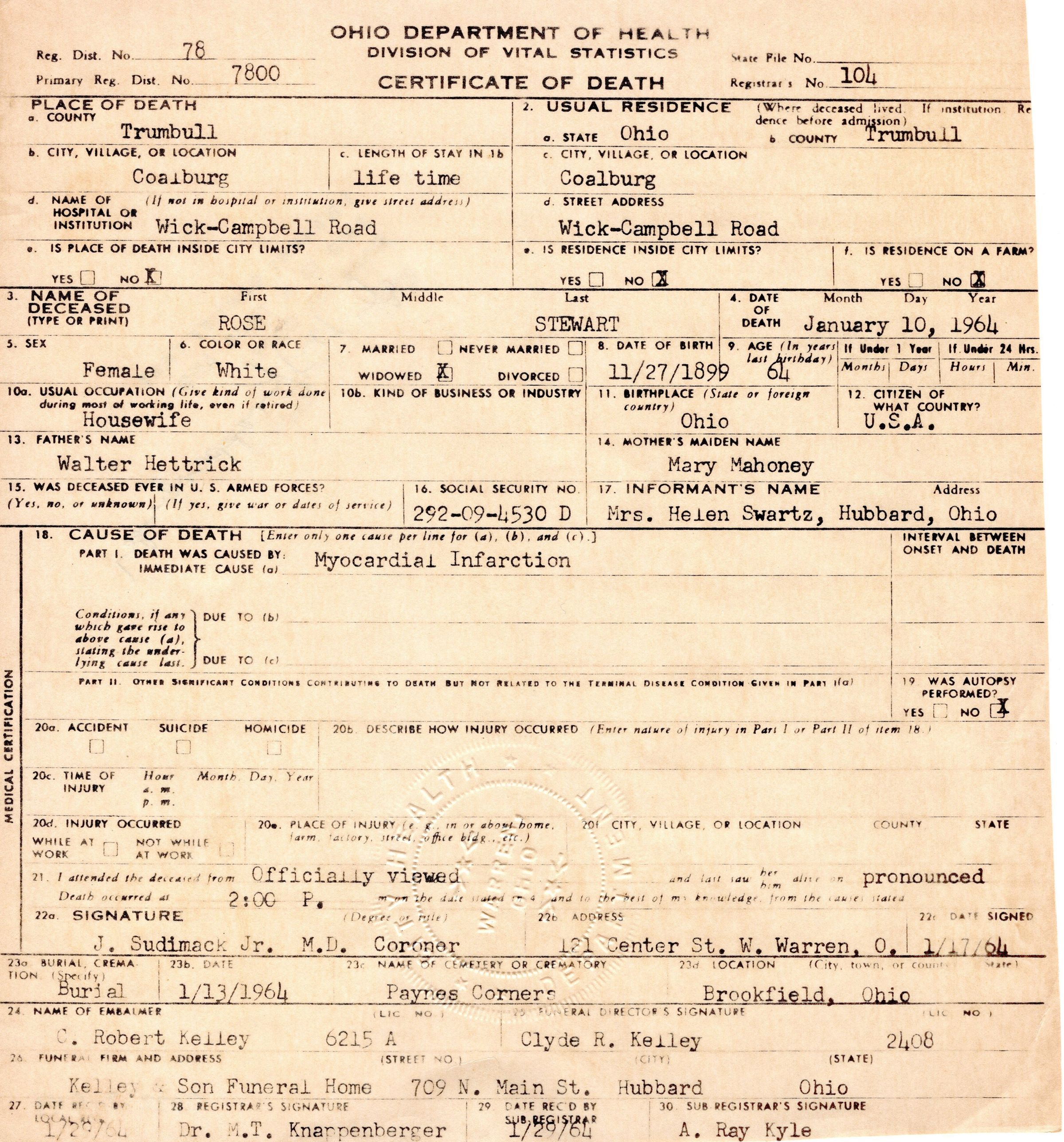 Death certificate for Rose Stewart, January 10, 1964.