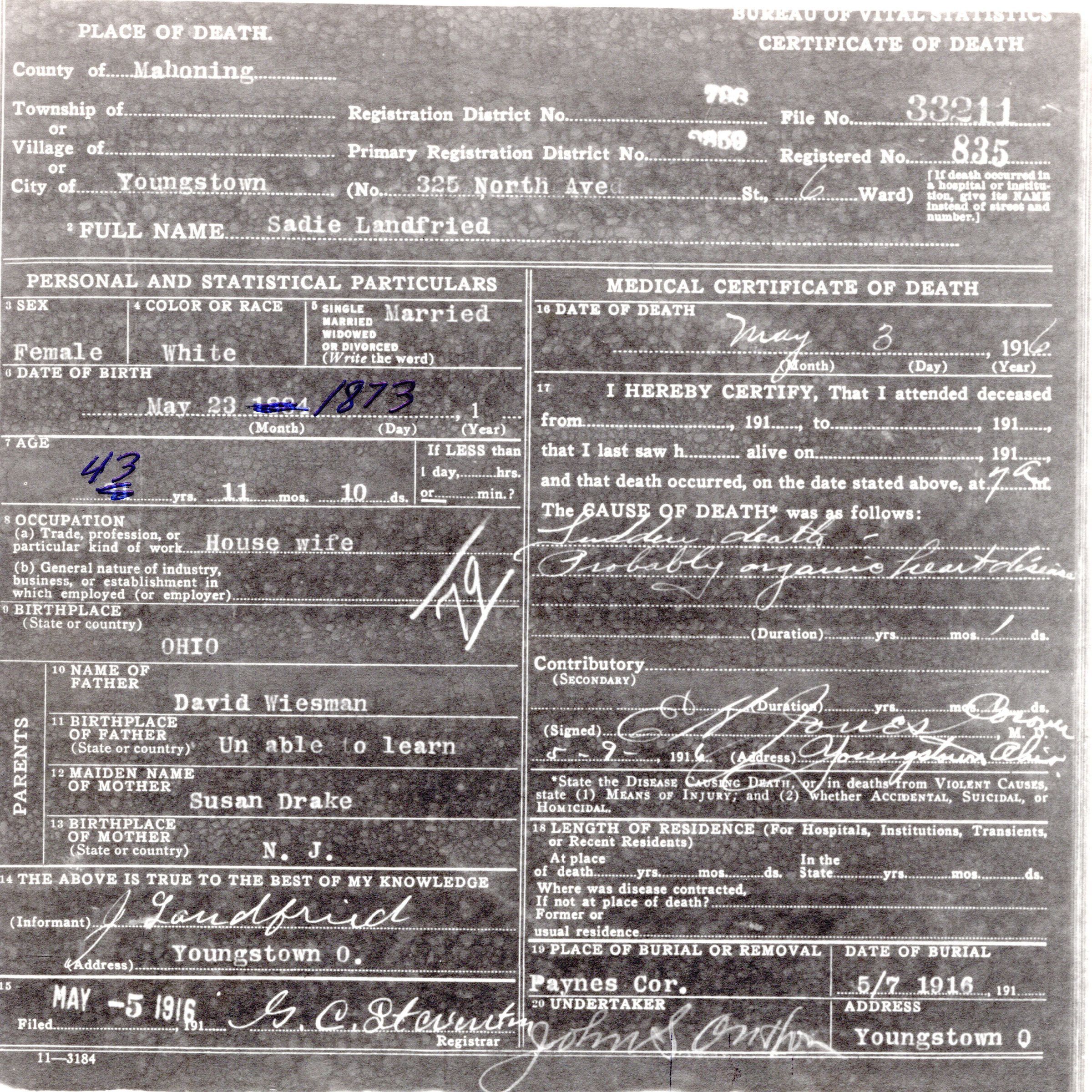 Death Certificate for Sadie Landfried, May 3, 1916