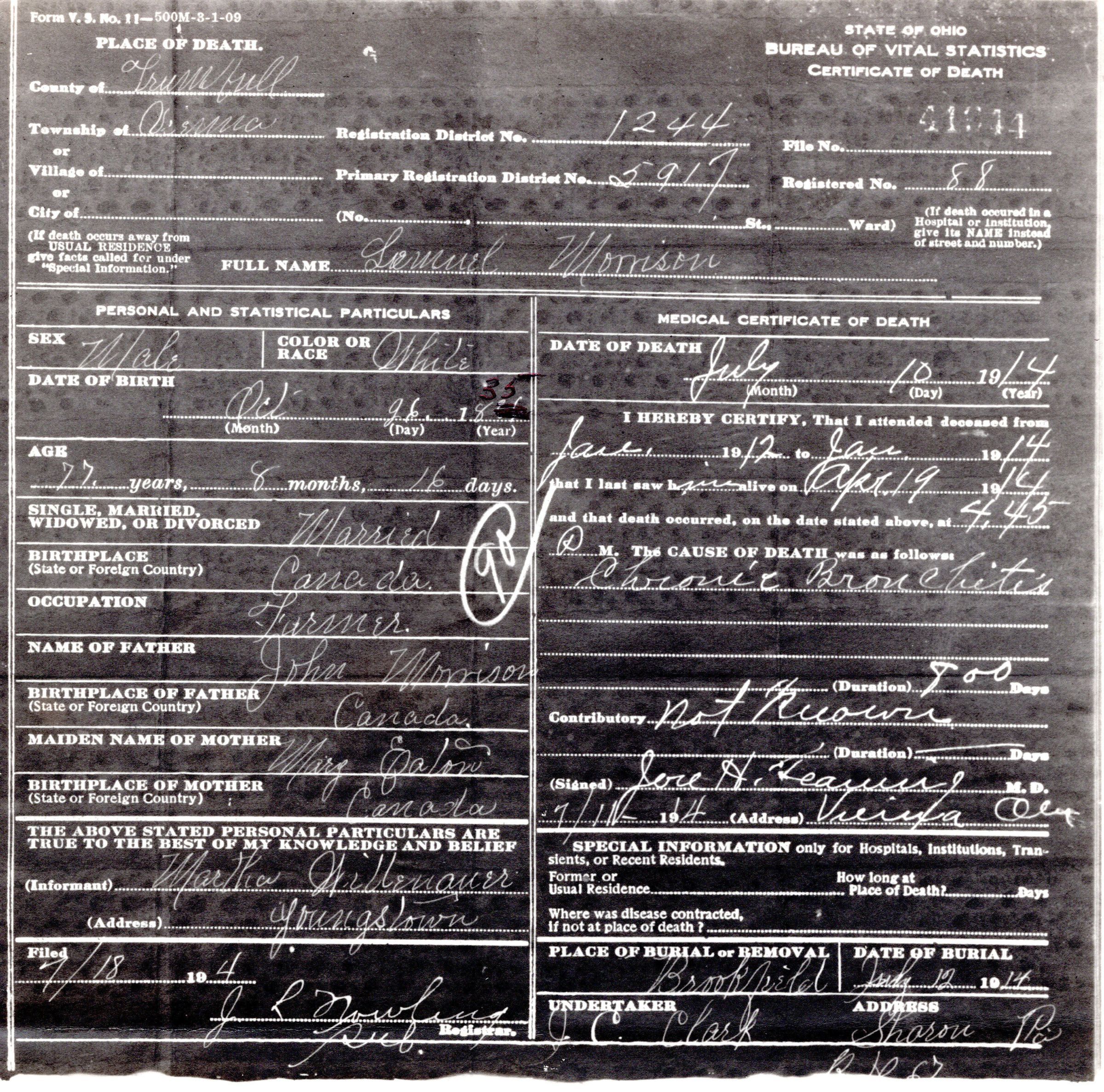 Death Certificate for Samuel Morrison, 1914