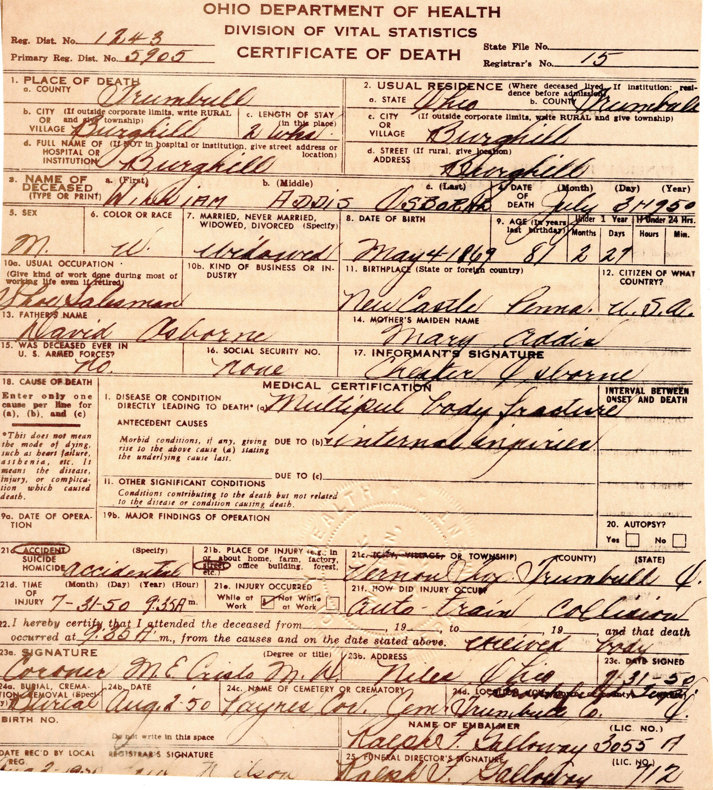 Death Certificate for William Addis Osborne, July 31, 1950.
