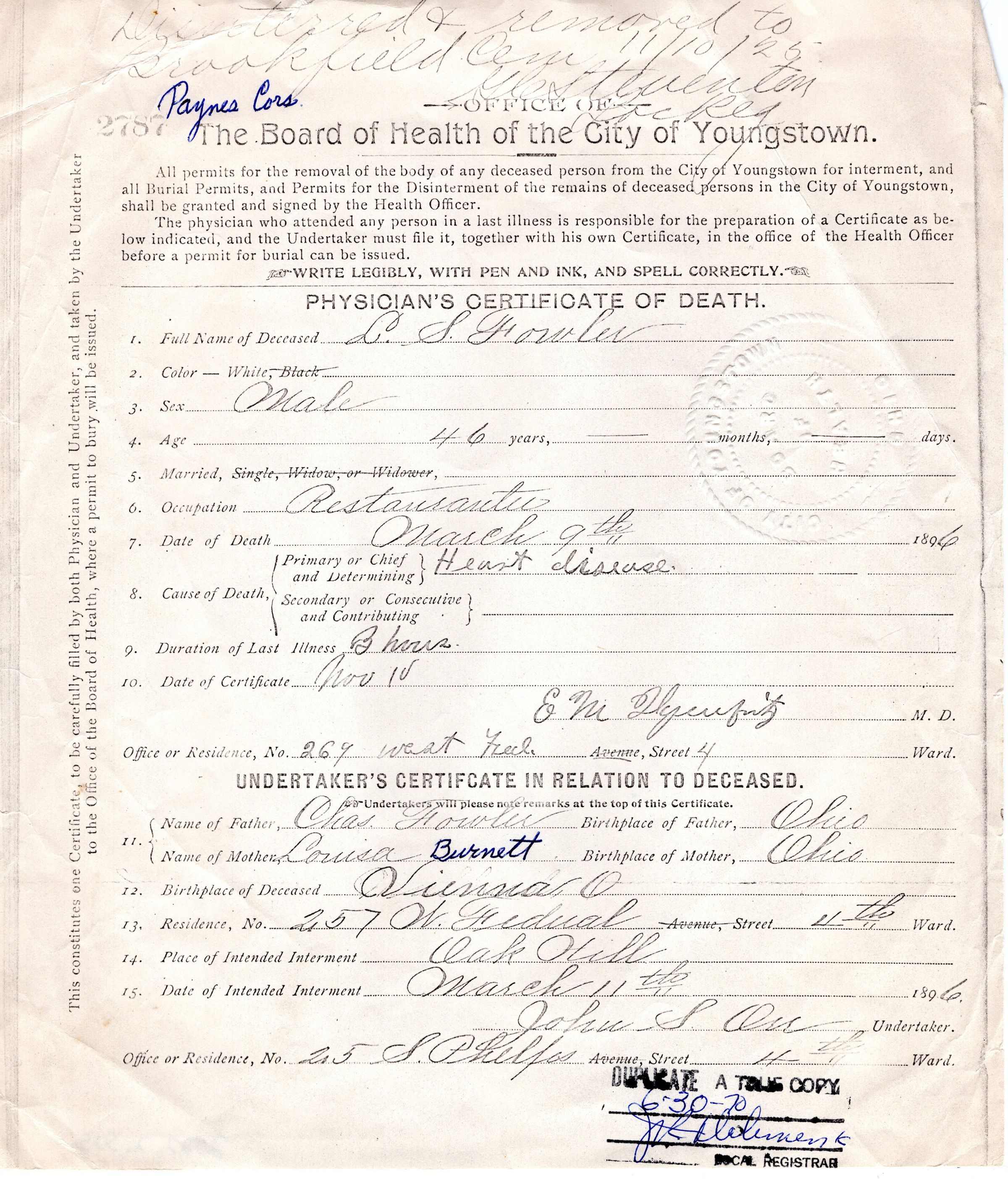 Death Certificate, Fowler, L. S., 1896