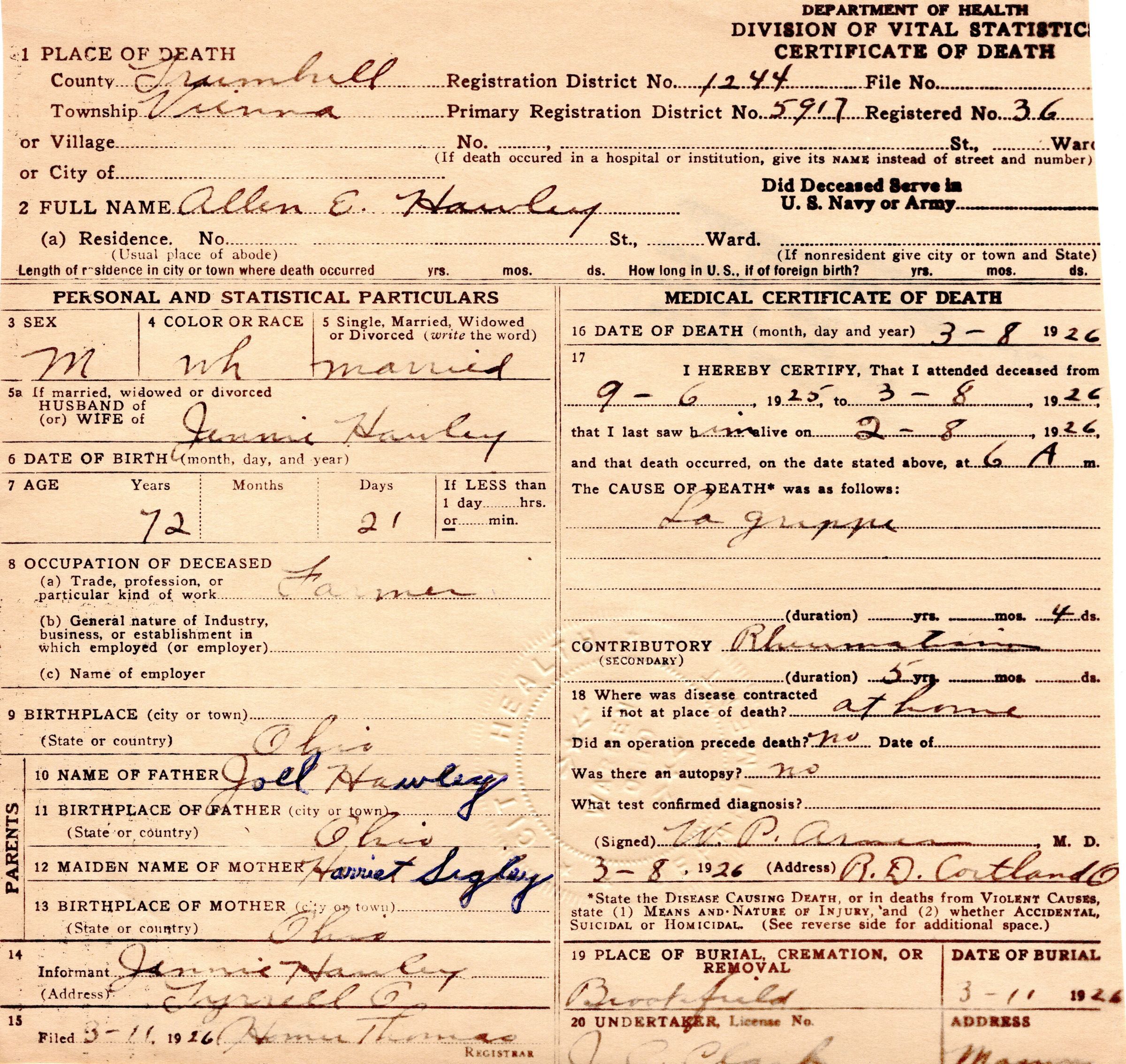 Death Certificate, Hawley, Allen E.