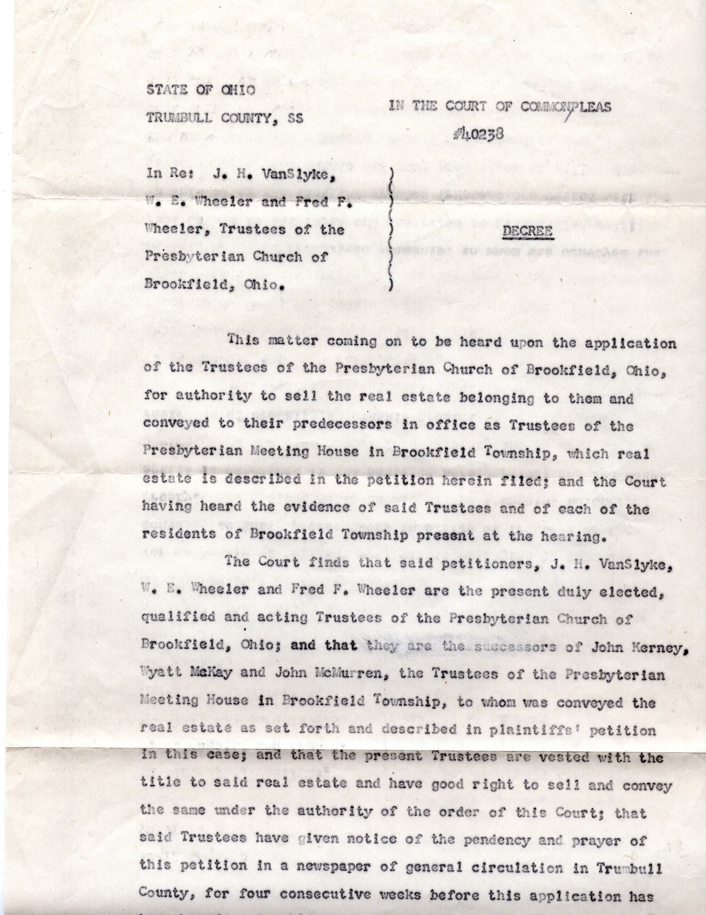Decree permitting sale of land for Brookfield Presbyterian Church in 1936