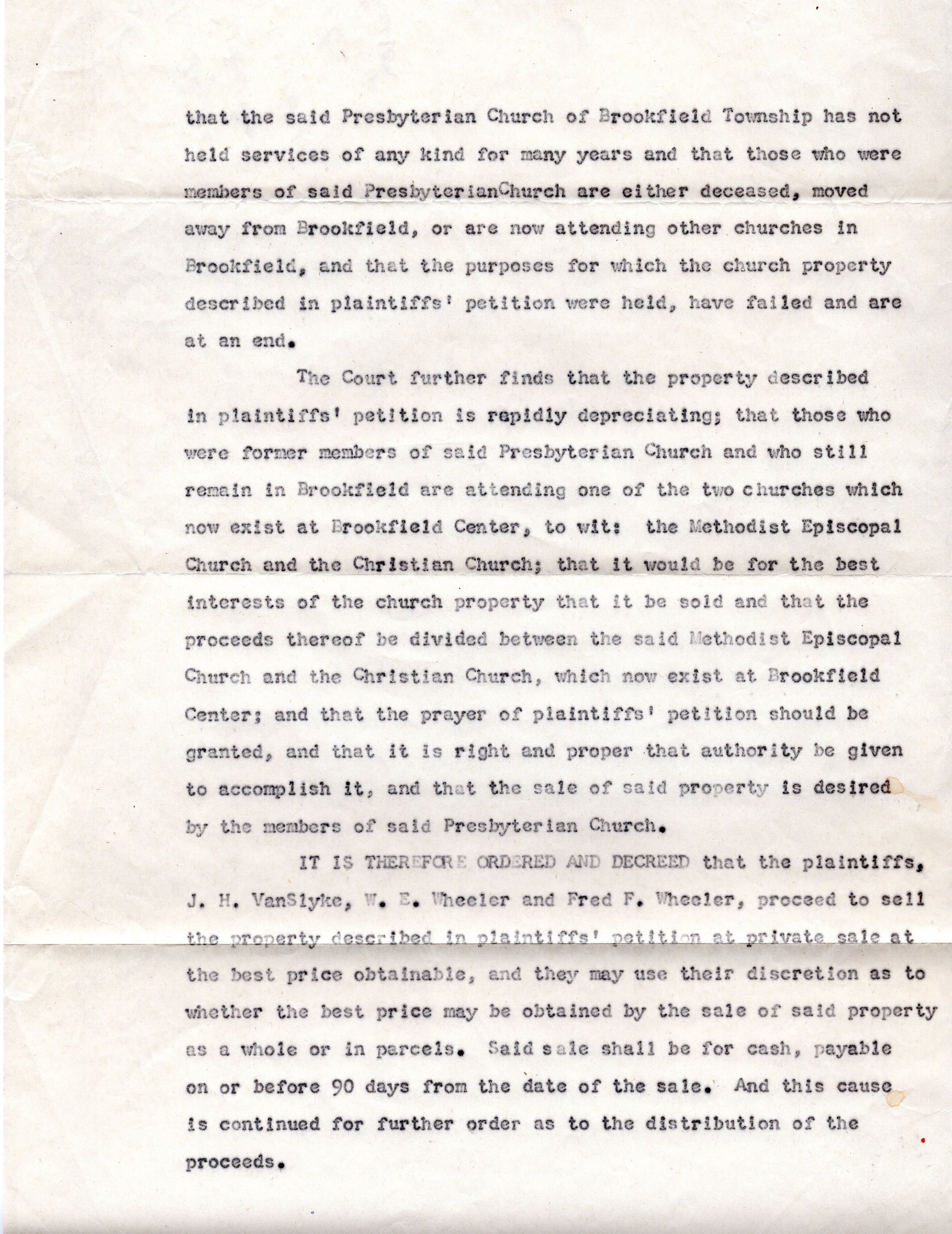Decree Permitting Sale of Brookfield Presbyterian Church Land 1936