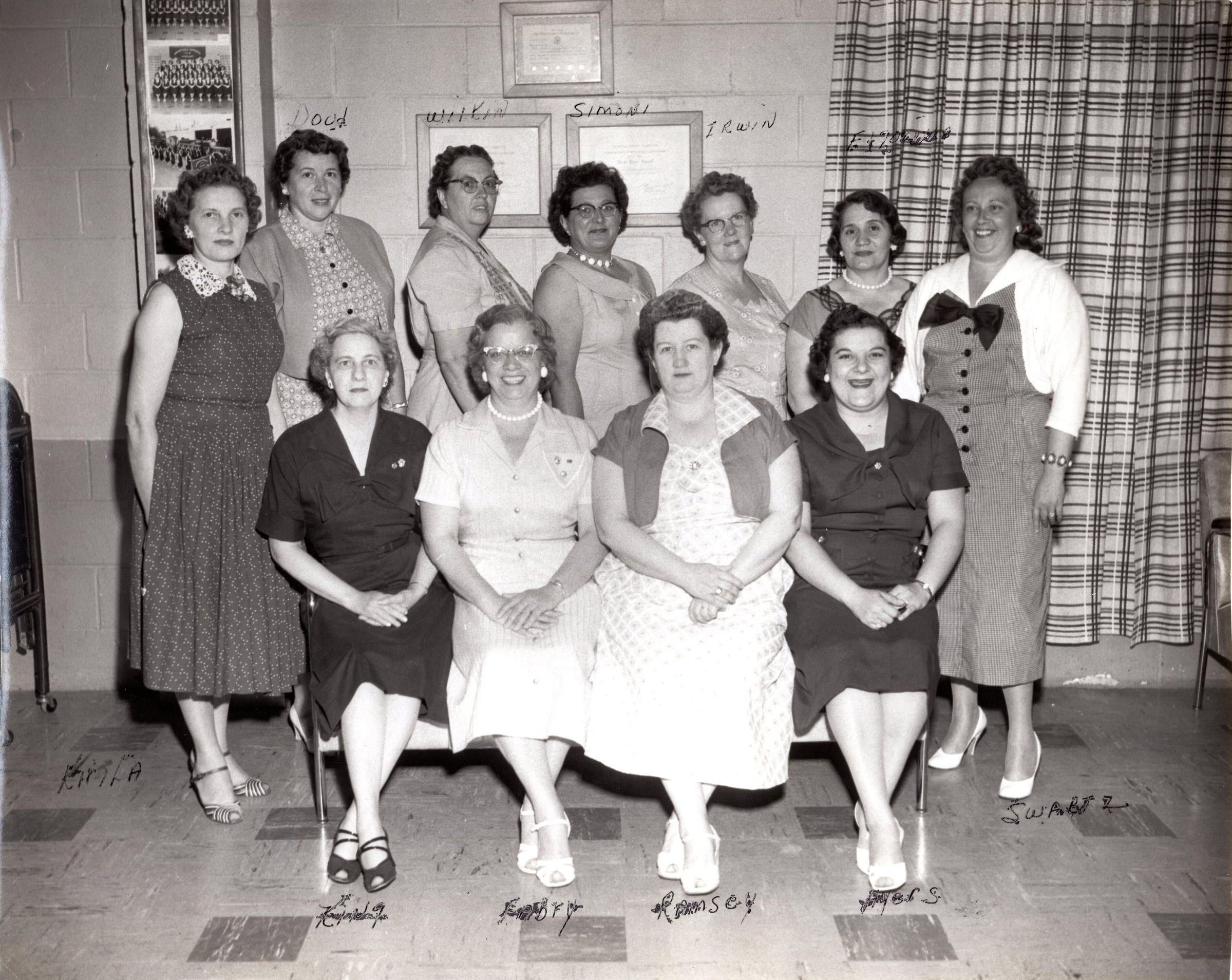 Photo of 1958 Homecoming officers, left to right, back row: Ann Kirila, Forrest Doud, Ione Wilkin, Lena Simoni, Tillie Irwin, [unreadable], Cel Swartz, Front Row: Kay King, Marian Fabry, Jessie Ramsey, Mary Ayers.