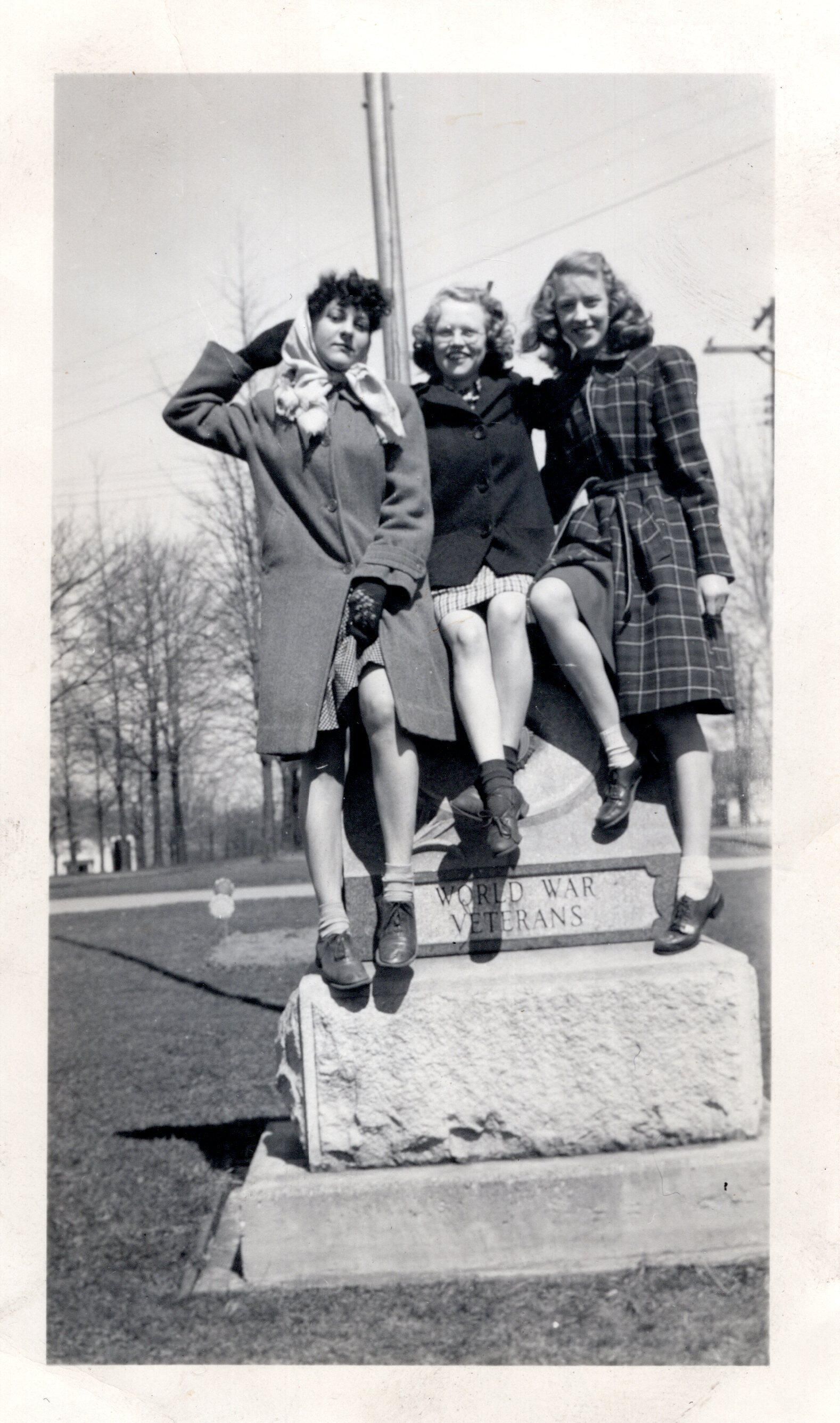 Photo of Mary Jane Bartolin and two unidentified persons on World War Veterans Monument.