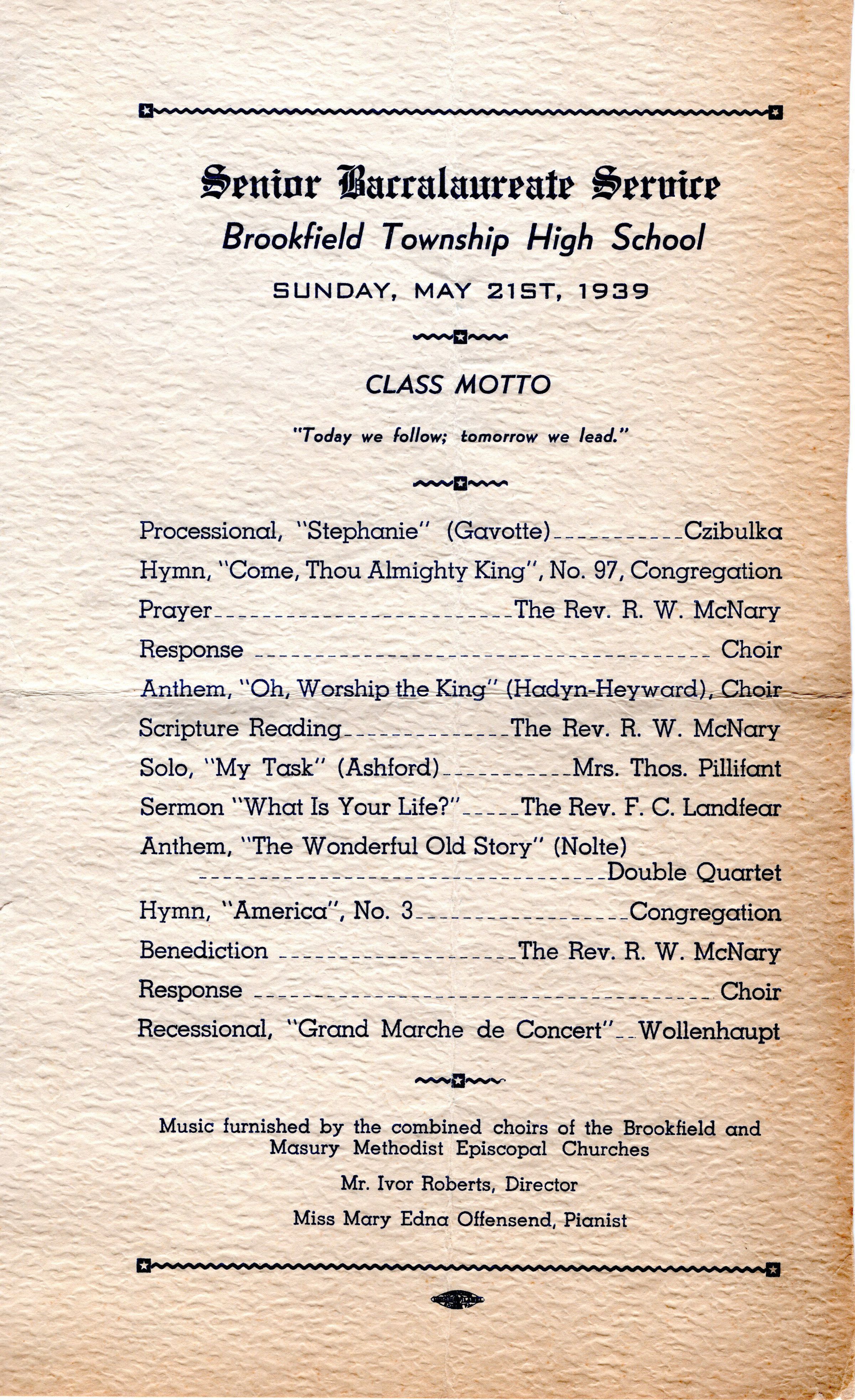 Program from 1939 Senior Baccalaureate Service.
