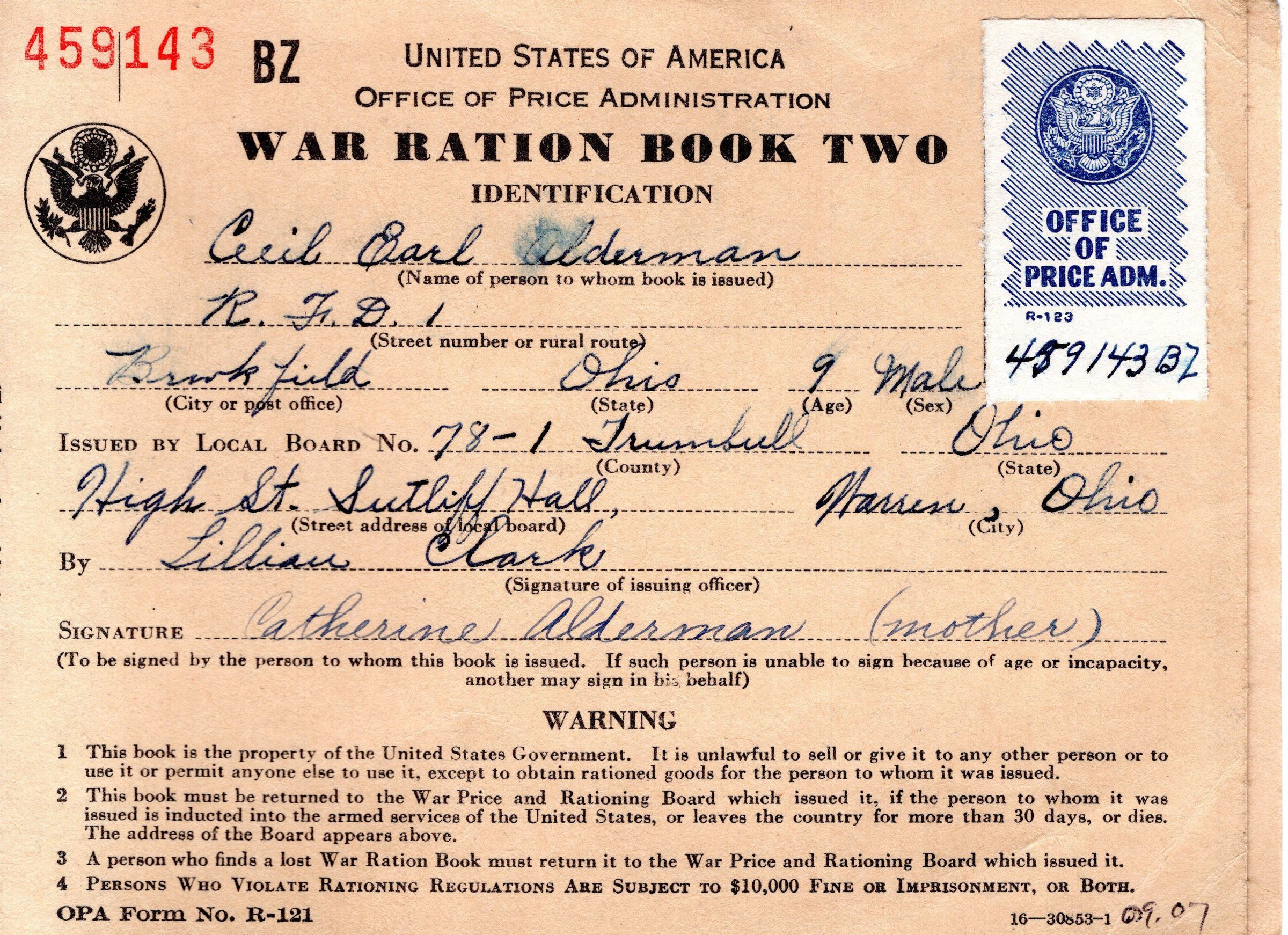 War Ration Book 2 issued to Cecil Earl Alderman, age 9.