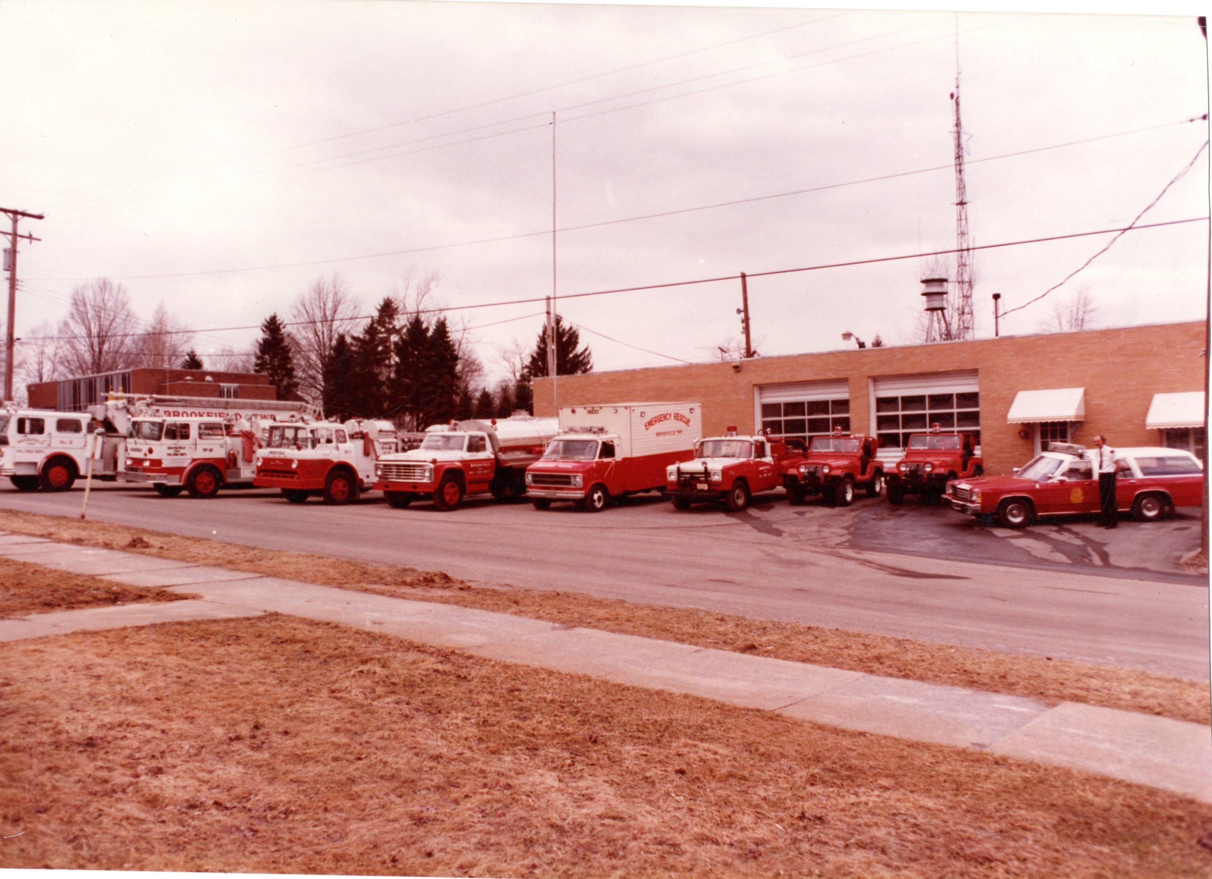 Photo of a group of firetrucks lined up in front of building in the 1980s with unidentified person