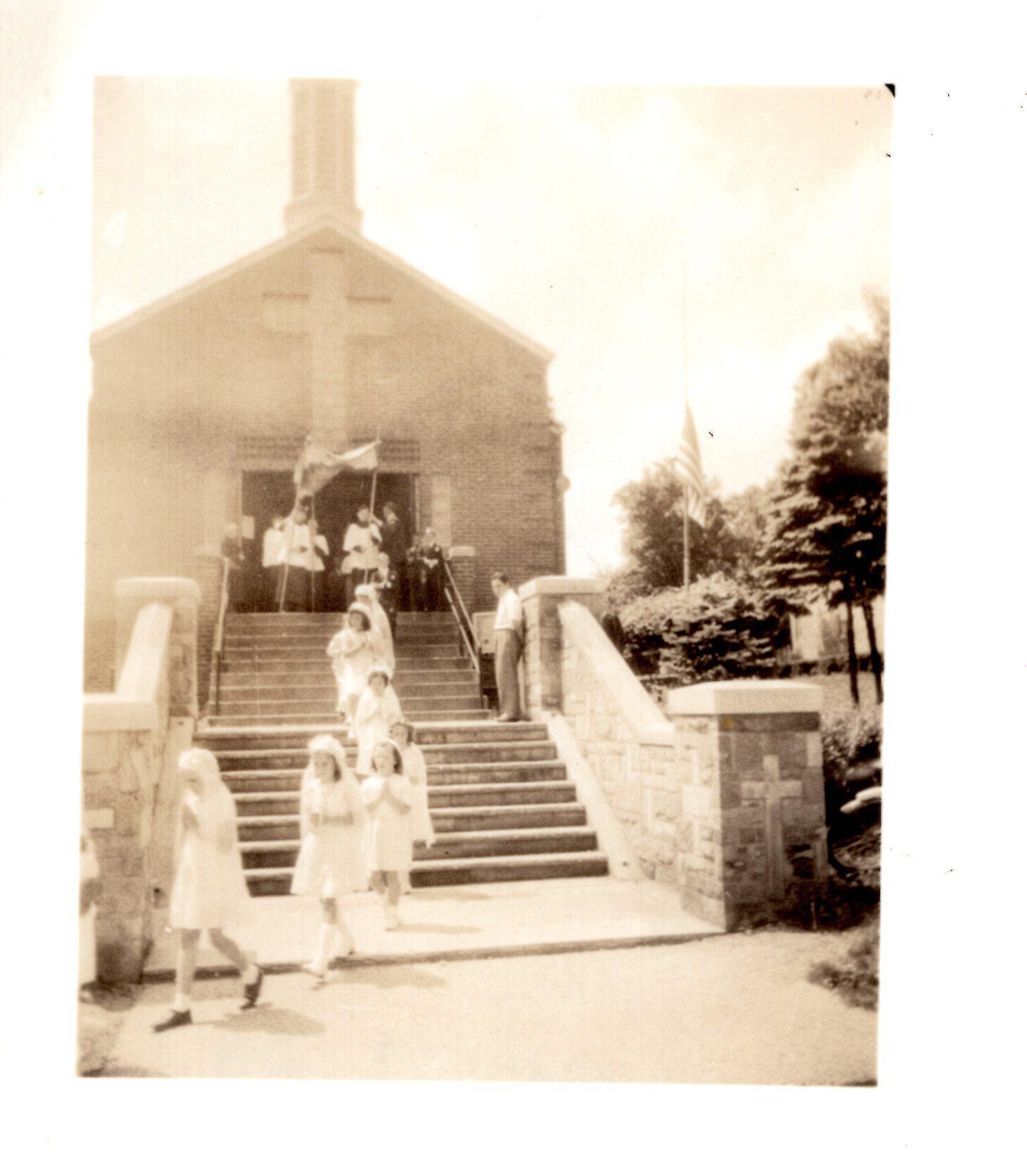 Church procession leaving the church; Corpus Christy is written on the back on the photo.