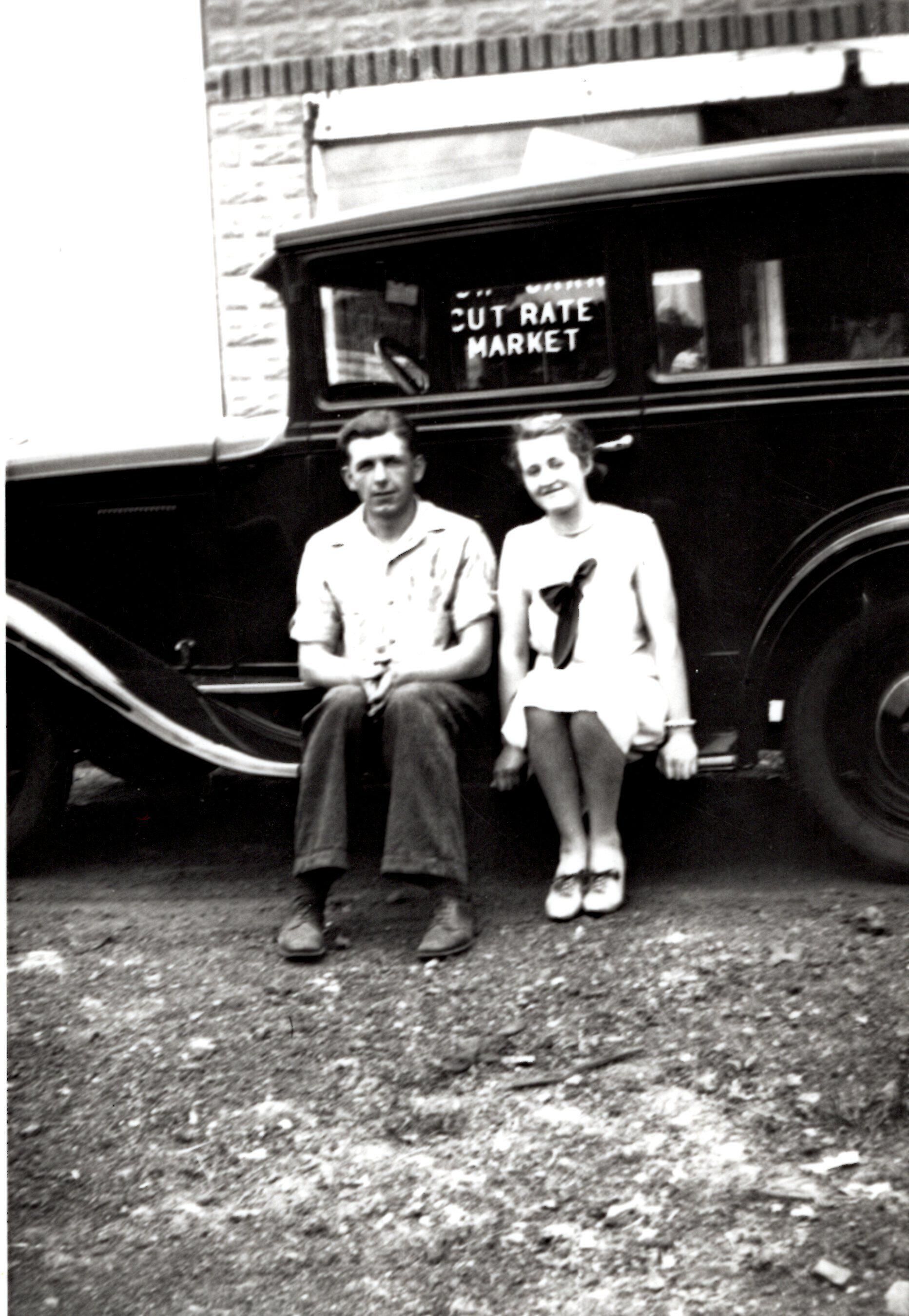 Photo of Franklin Snyder and Aunt Ann sitting on the running board of a car.