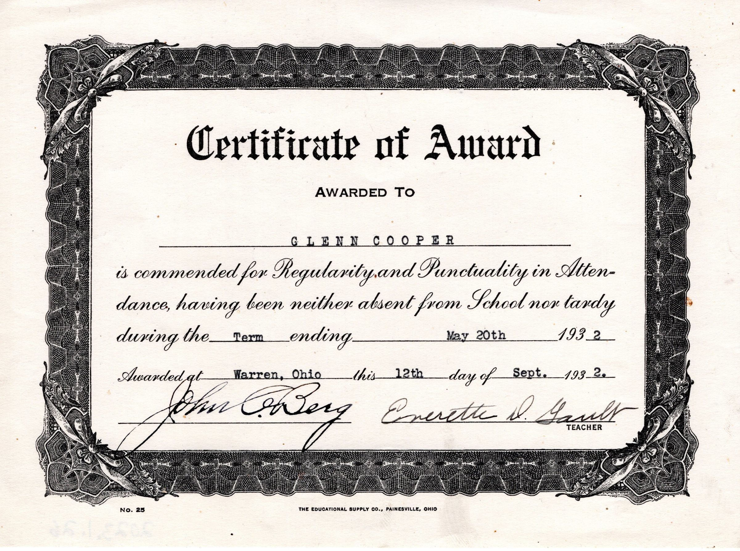 Certificate of Award to Glenn Cooper for perfect attendance. Awarded at Warren, Ohio on September 12th, 1932.