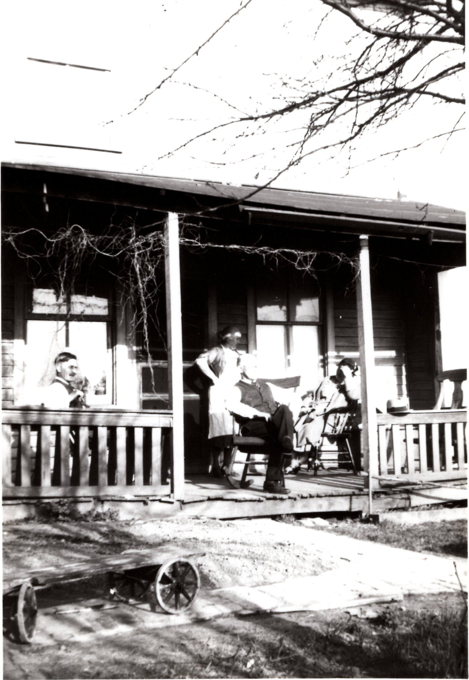 Photo of Grandpa Obermiyer, Aunt Ann Obermiyer (Faller), and Uncle Clarence Faller, sitting on back porch at Obermiyer apartment. Brookfield, Center.