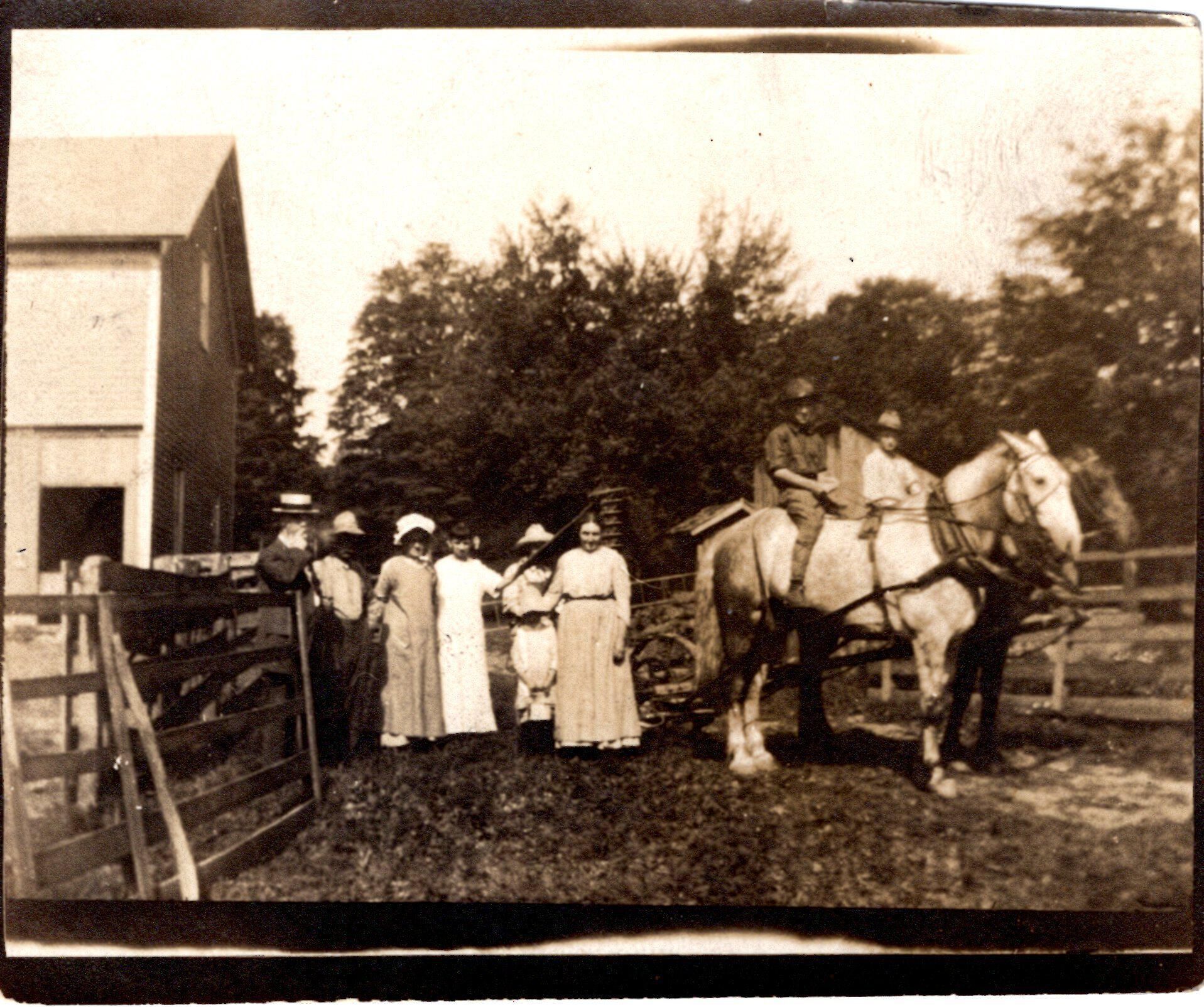 Photo of a group of 8 unidentified people, 2 of them on horses.