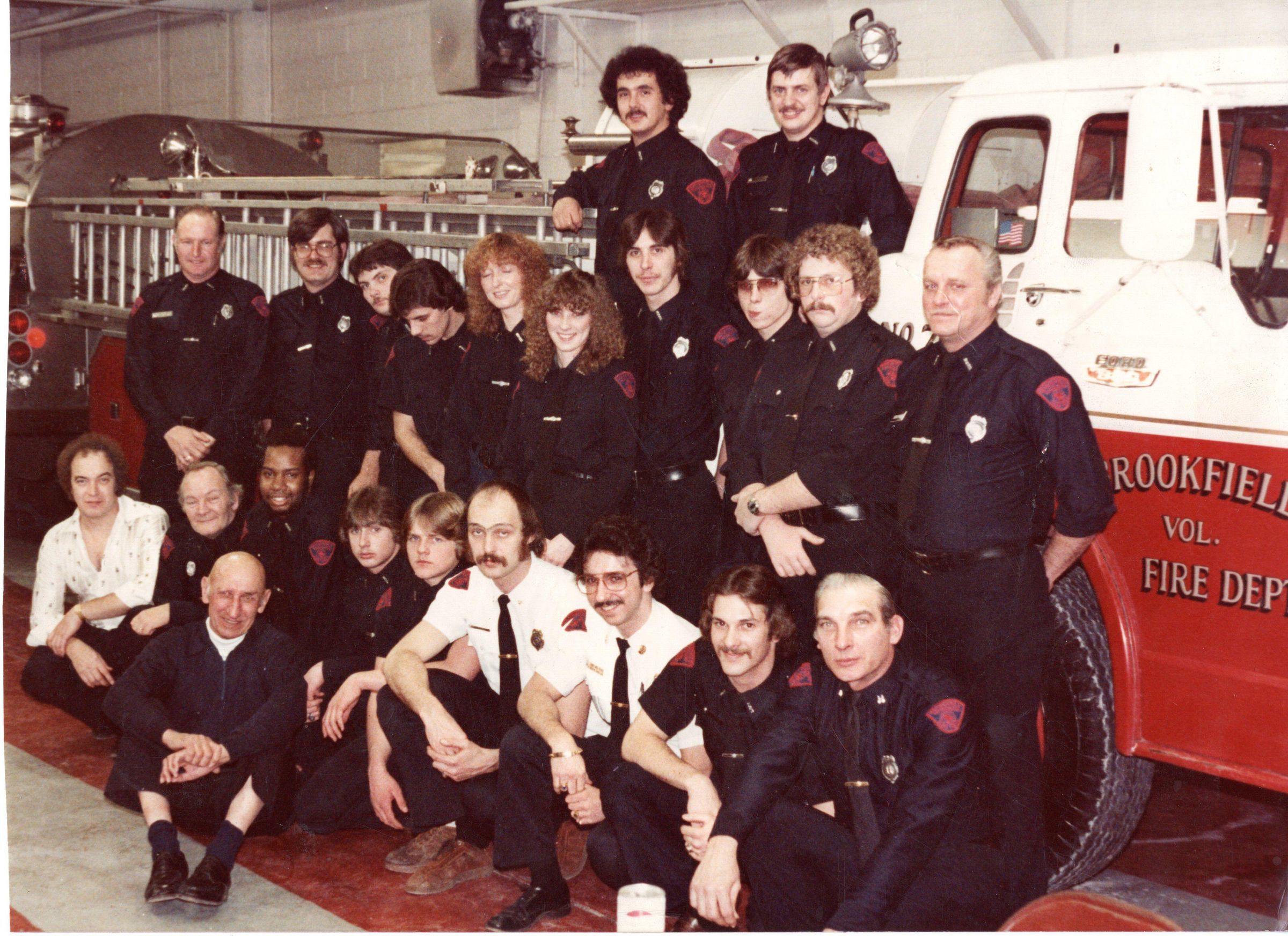 Photo of a group of Brookfield firemen with a firetruck in 1981-1982