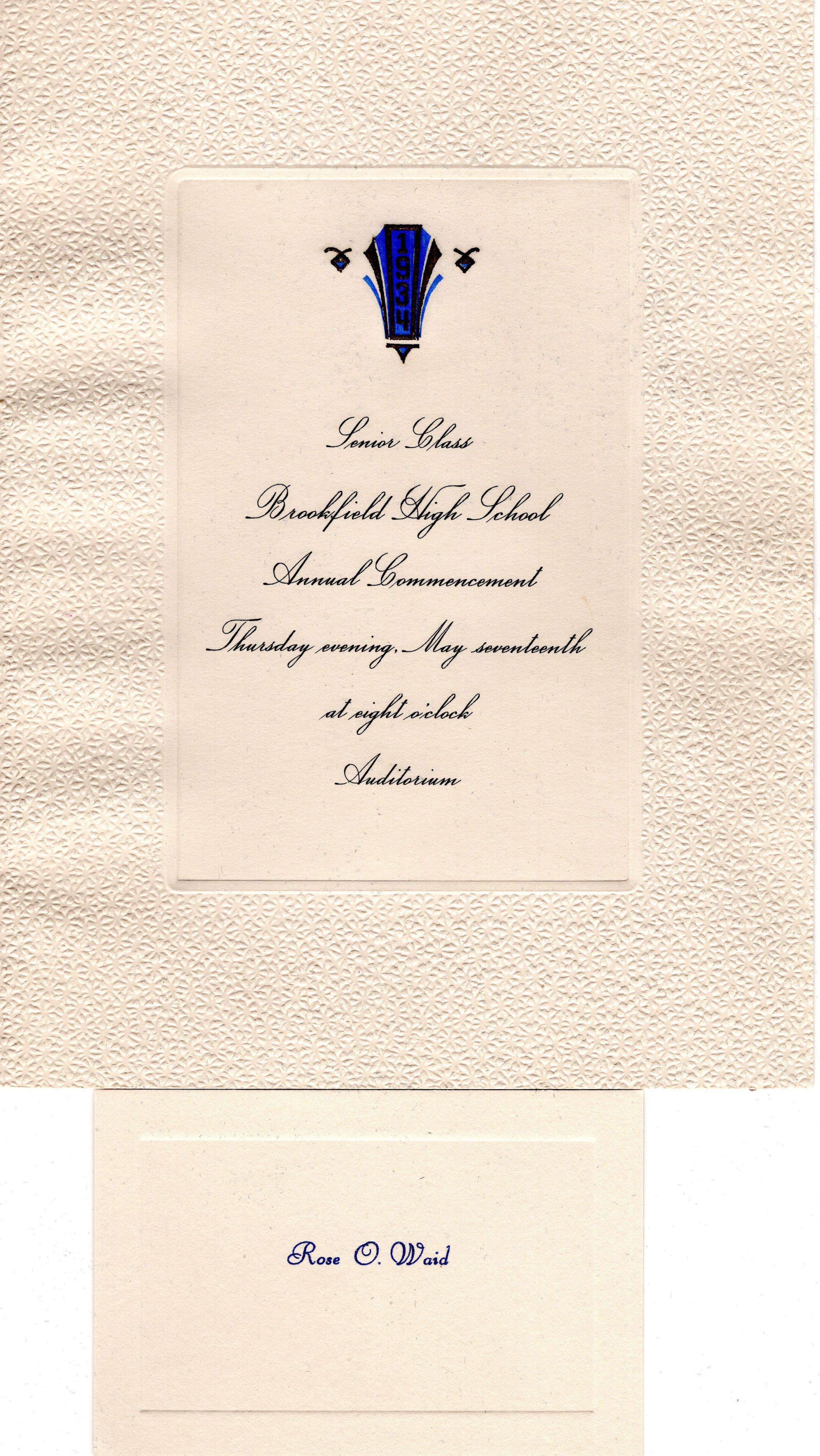 Announcement for Brookfield High School Commencement, Class of 1934. Rose O. Waid graduate.