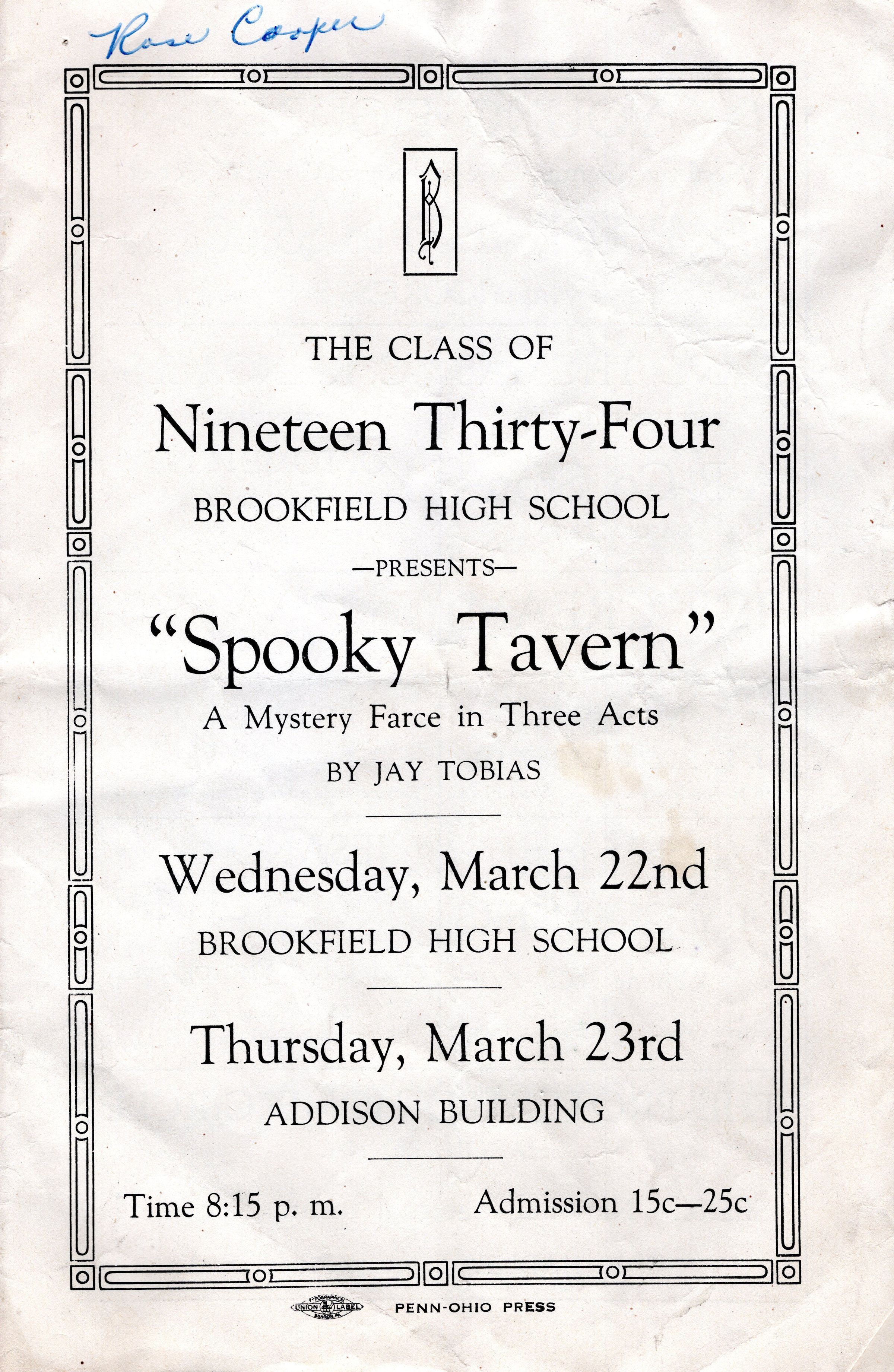 Program for "Spooky Tavern" high school play, Class of 1934.