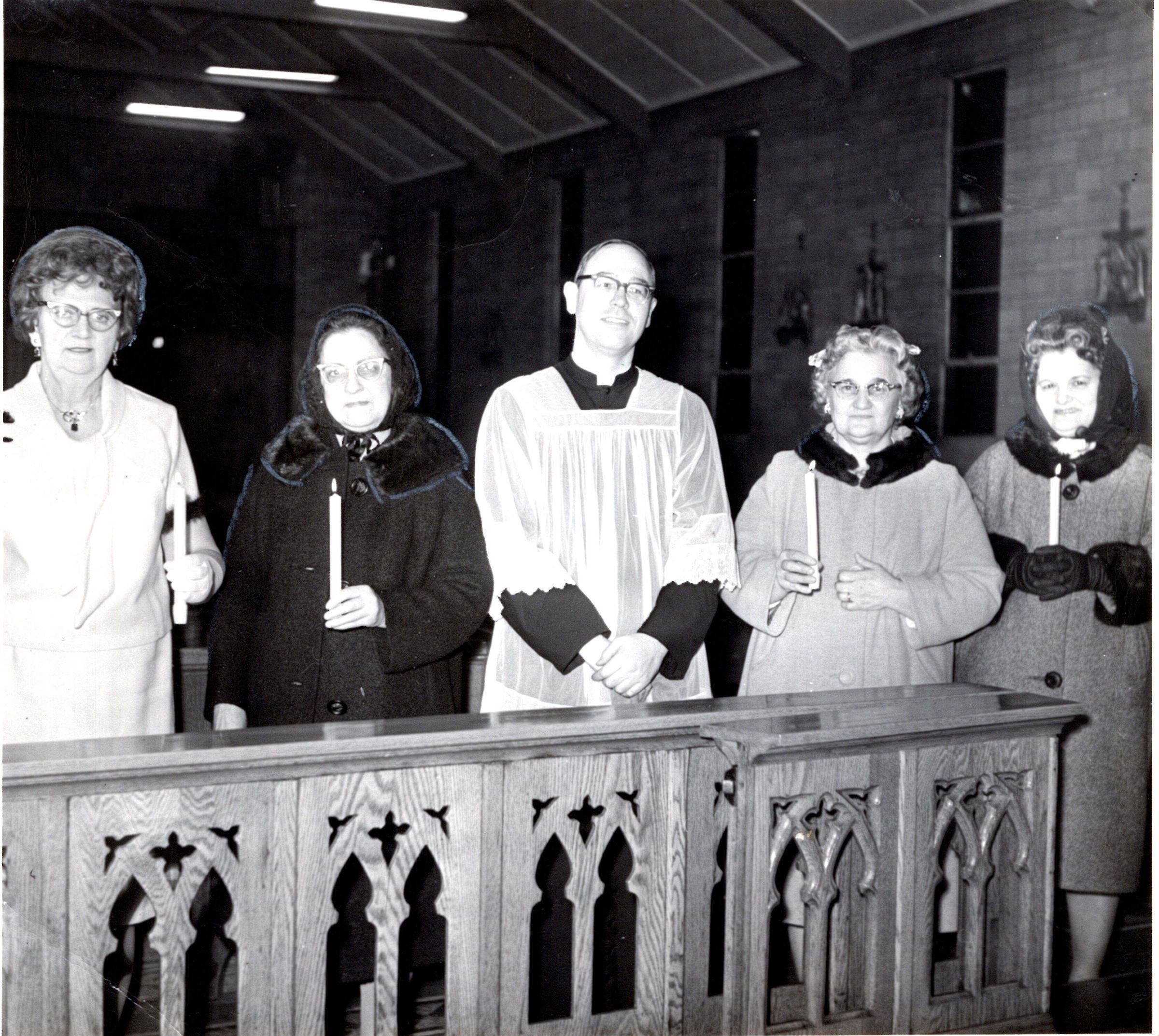 Photo of Father Culp, Mary Kozarich and Mrs. Smith at installment of officers in St. Bernadette's Church, Masury, Ohio on December 14,1966.