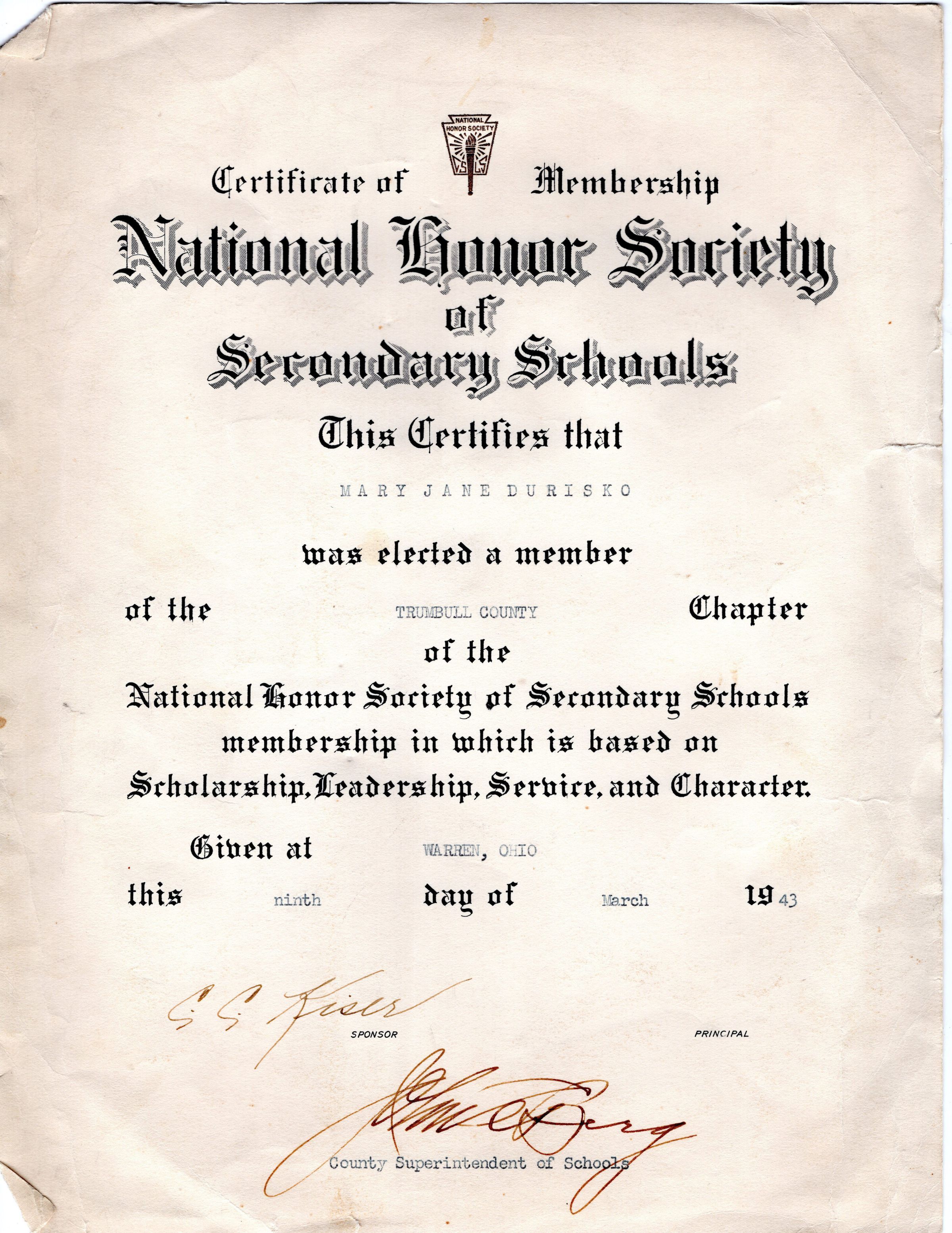 Certificate of Membership in National Honor Society of Secondary Schools awarded to Mary Jane Durisko on March 9th, 1943 in Warren, Ohio.