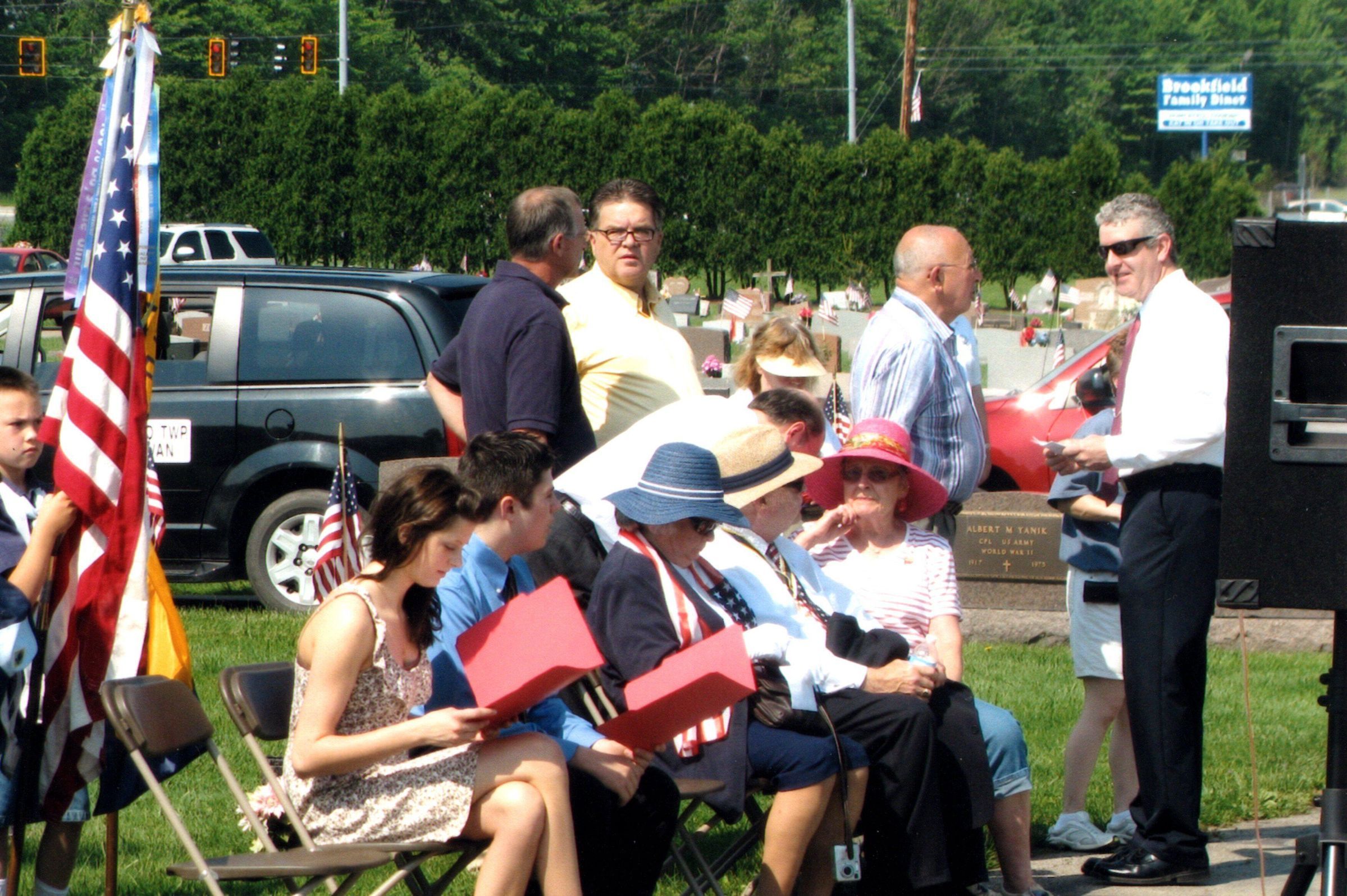 Photo of people at Memorial Day Ceremony, May 29, 2011. Pictured are speaker Dan Allison and wife Dianne Hall Allison, Historical Society President Elizabeth Boozer, and Rotary Club President and moderator Dan Briceland speaking with Phil Schmitt, Township Trustee. May 29, 2011.