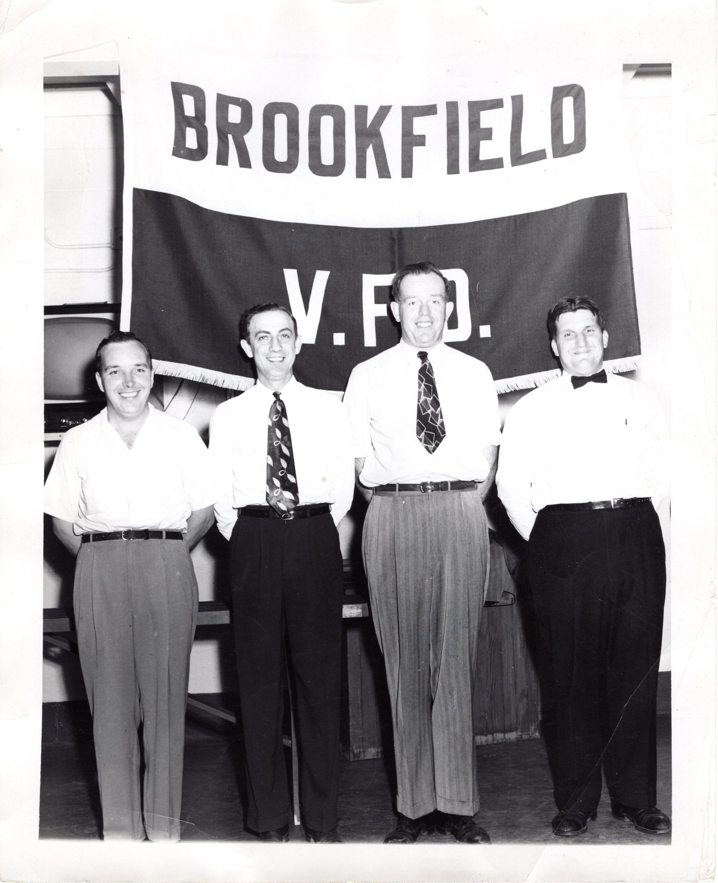 Photo of Frank Ayres, Max Bartosh, Temple Wilkins and Bill Bebech in front of Brookfield V.F.D. sign.