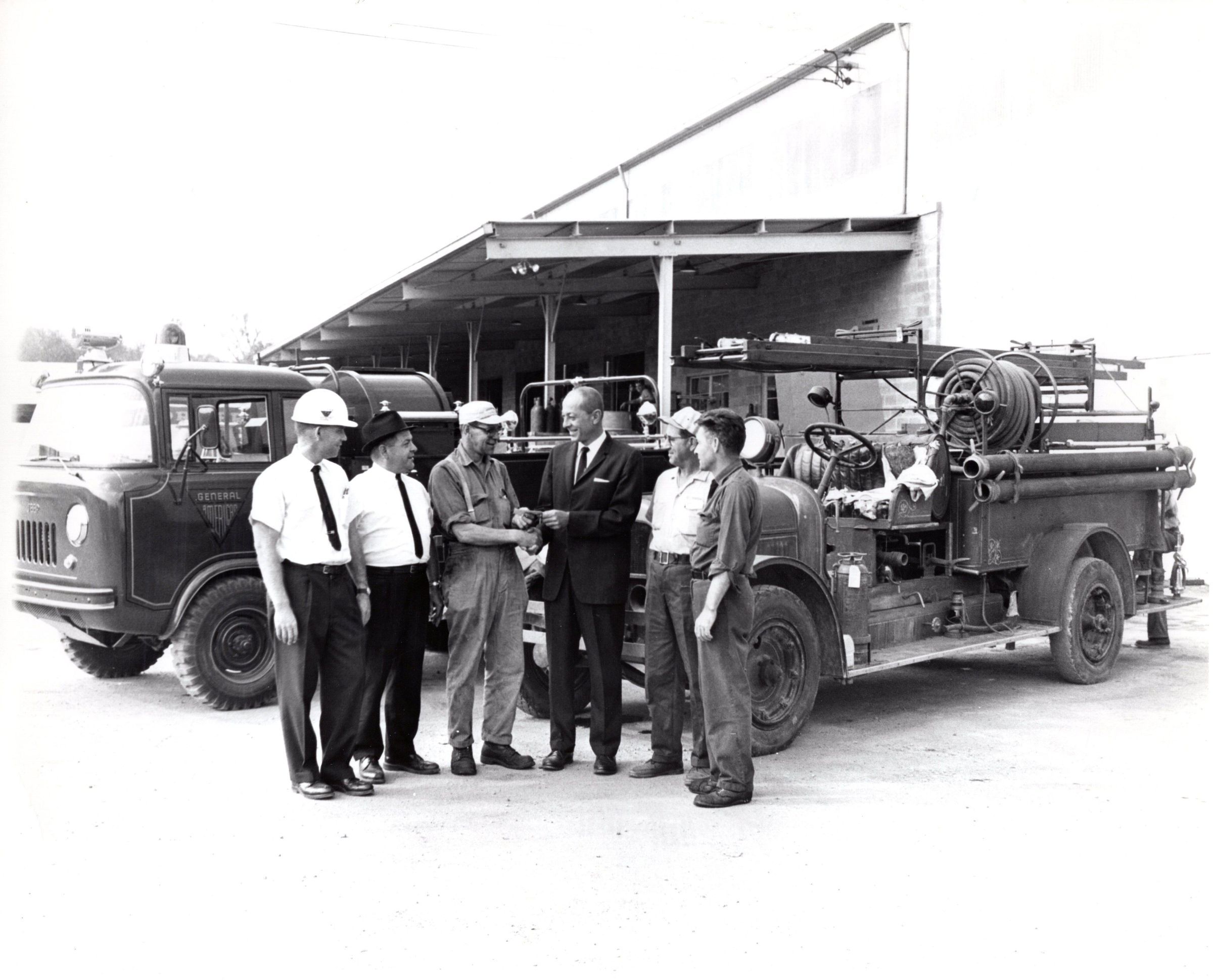 Photo of a group of men in front of firetrucks