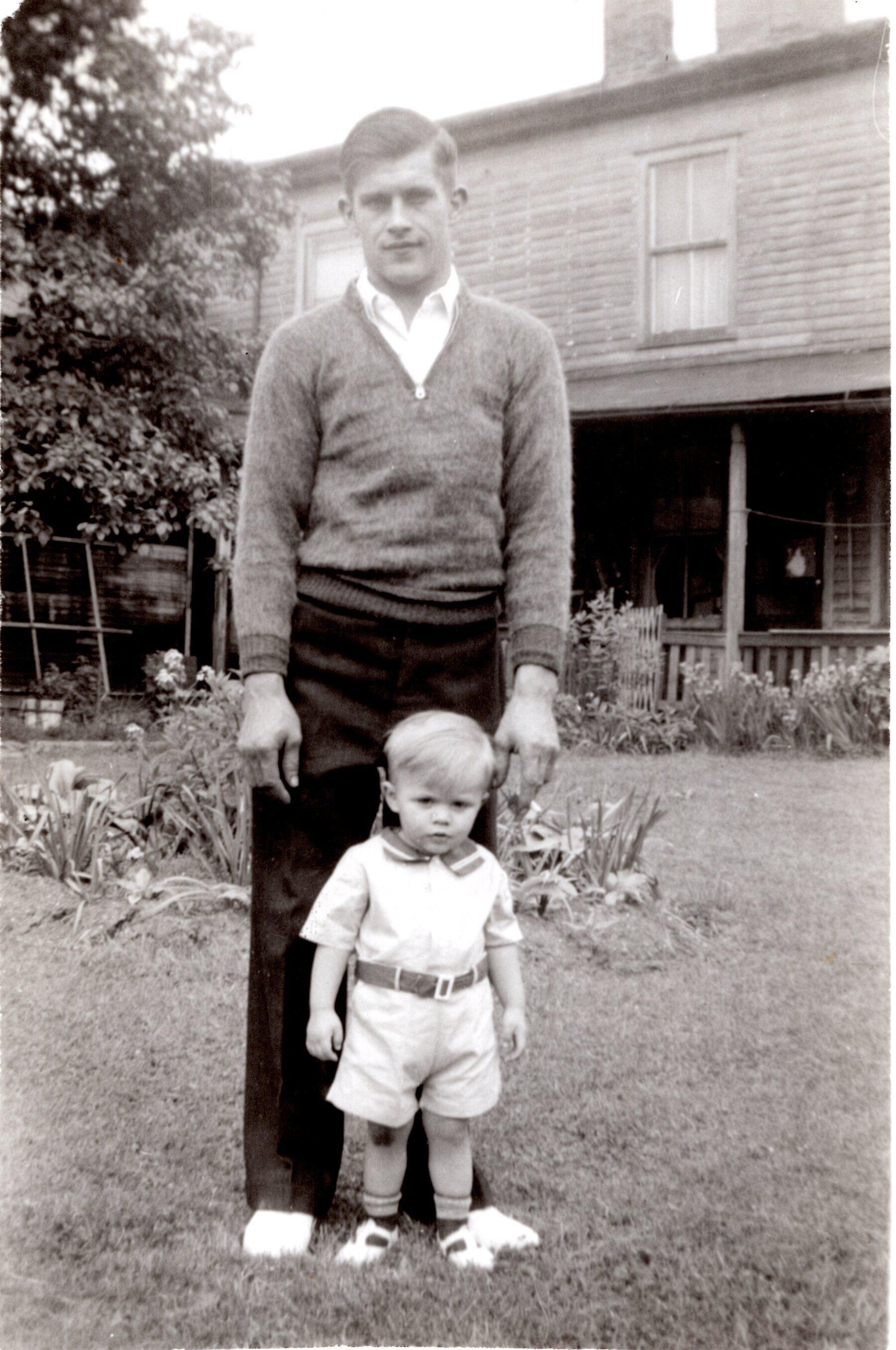 Photo of Dad (Mike Obermiyer) and his son Jim at age 2 years in the backyard of Obermiyer apartment at Brookfield Center.