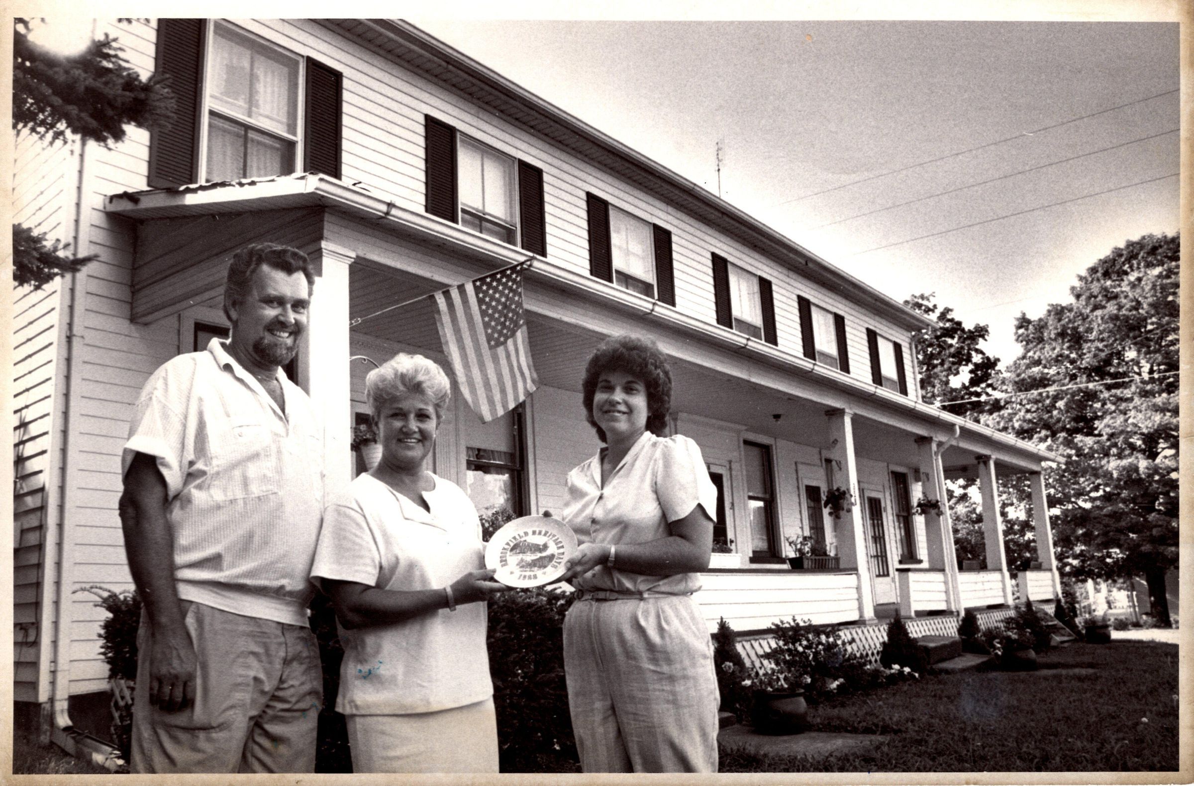 Photo of Joseph Obermiyer, Betty (Obermiyer) Detelich, and Barb Obermiyer at the Obermiyer building.