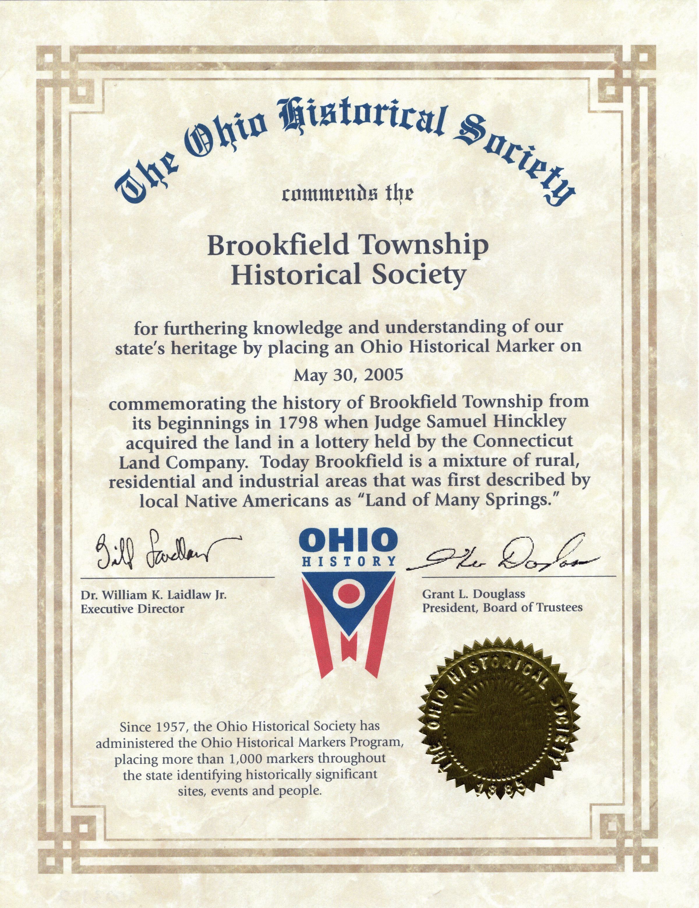 Certificate for Ohio Historical Marker from the Ohio Historical Society, May 30, 2005.