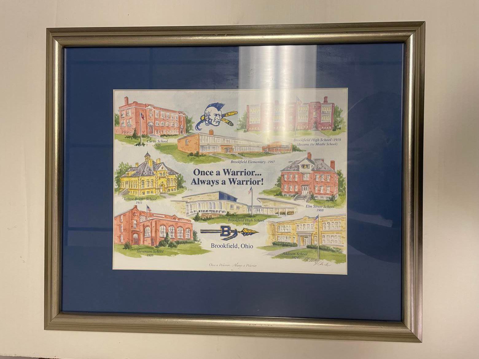 Picture of Brookfield's schools through history and school mascot. Contains the phrase "One a Warrior... Always a Warrior!" Newest school pictured dates to 1997. Painting by L. Clark.