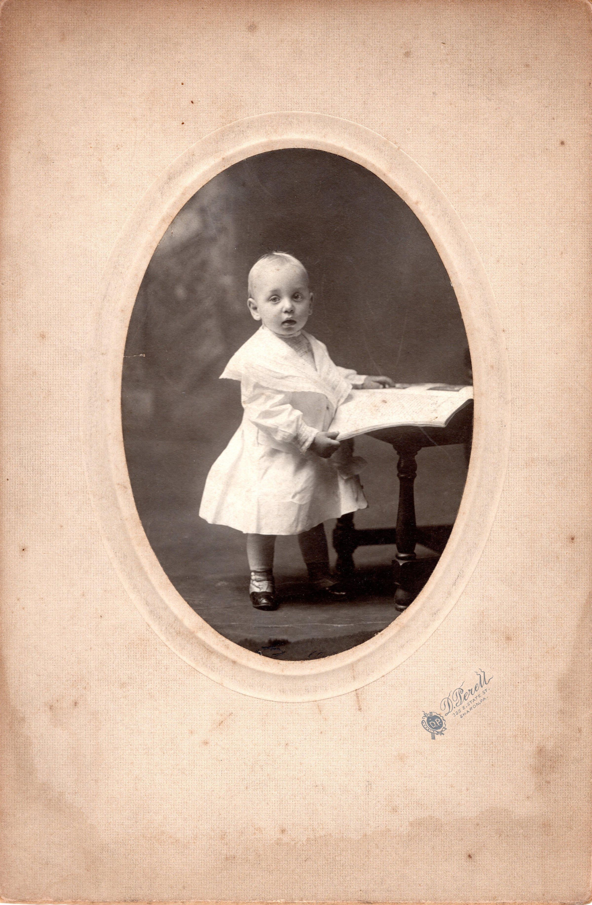 Portrait photo of an unidentified child standing beside a low table.