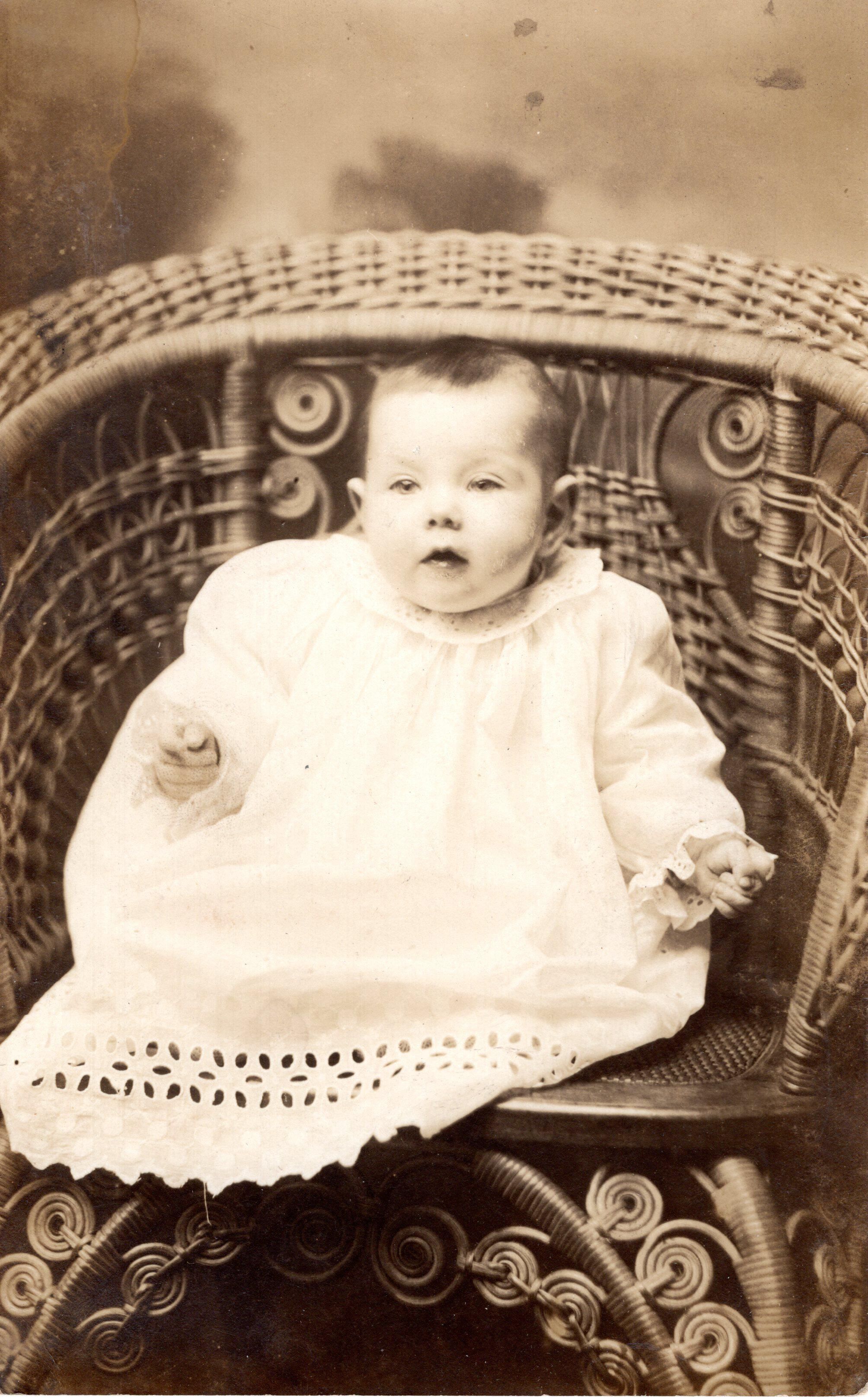 Portrait photo of unidentified baby sitting in a chair.