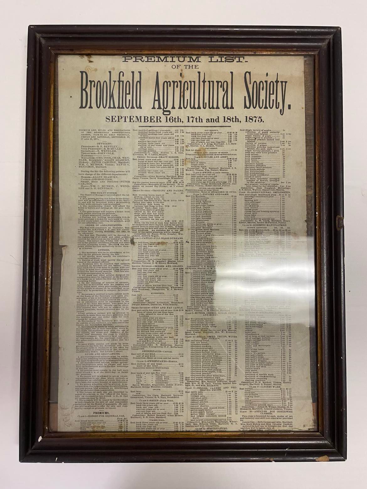 Framed list of rules and regulations of the Brookfield Agricultural Society's Fair, held September 16th, 17th, and 18th, 1875.
